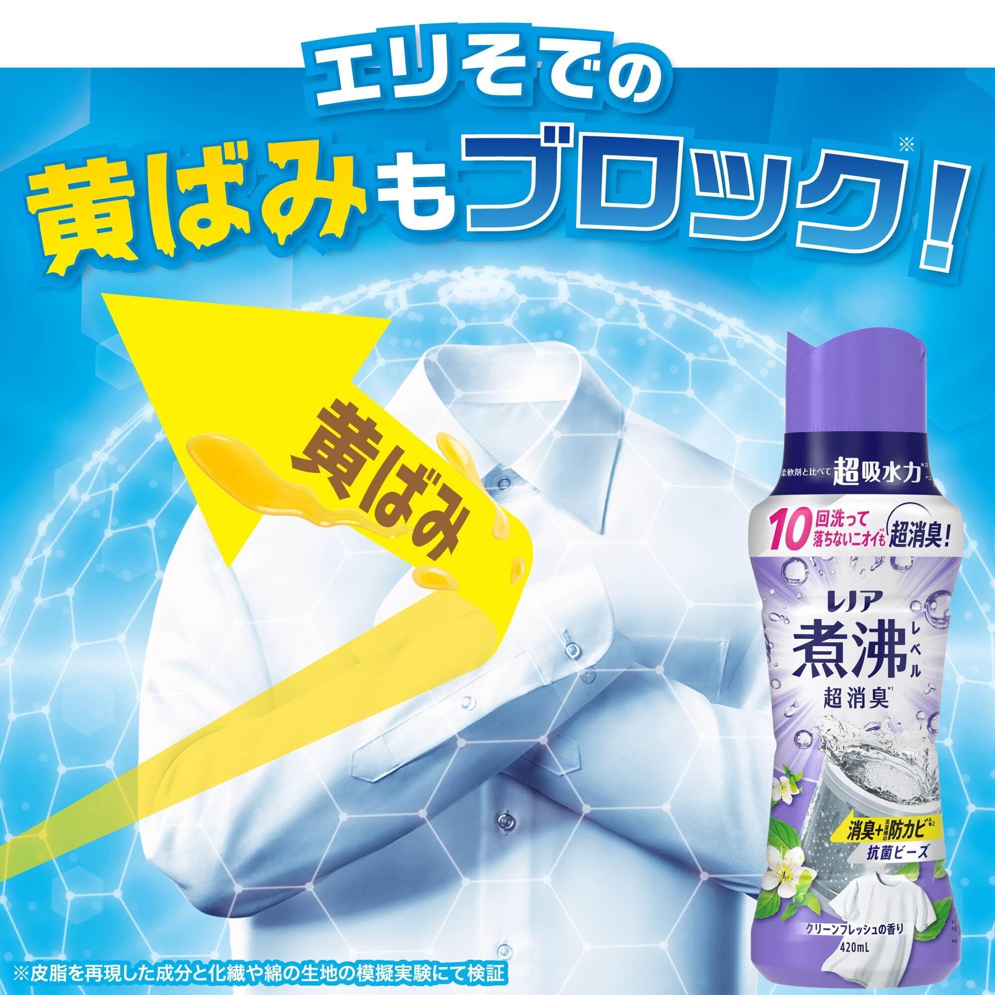 衣類の煮沸レベル消臭*1 洗濯槽の防カビ*2 まで! レノア 超消臭 煮沸レベル消臭 抗菌ビーズ 消臭+防カビ クリーンフレッシュ