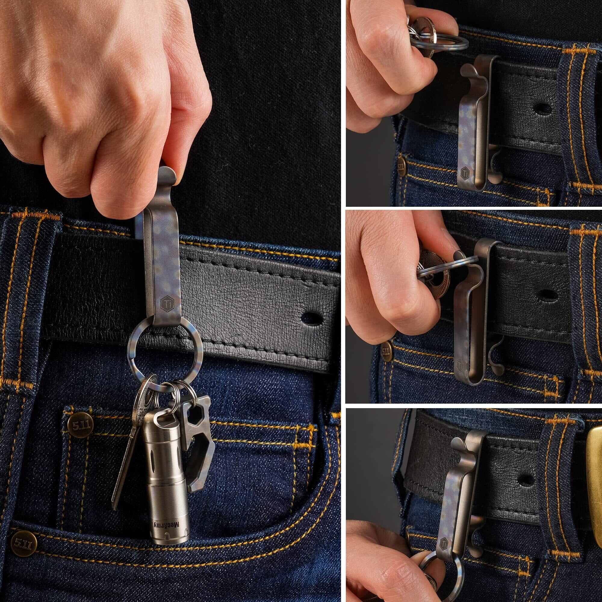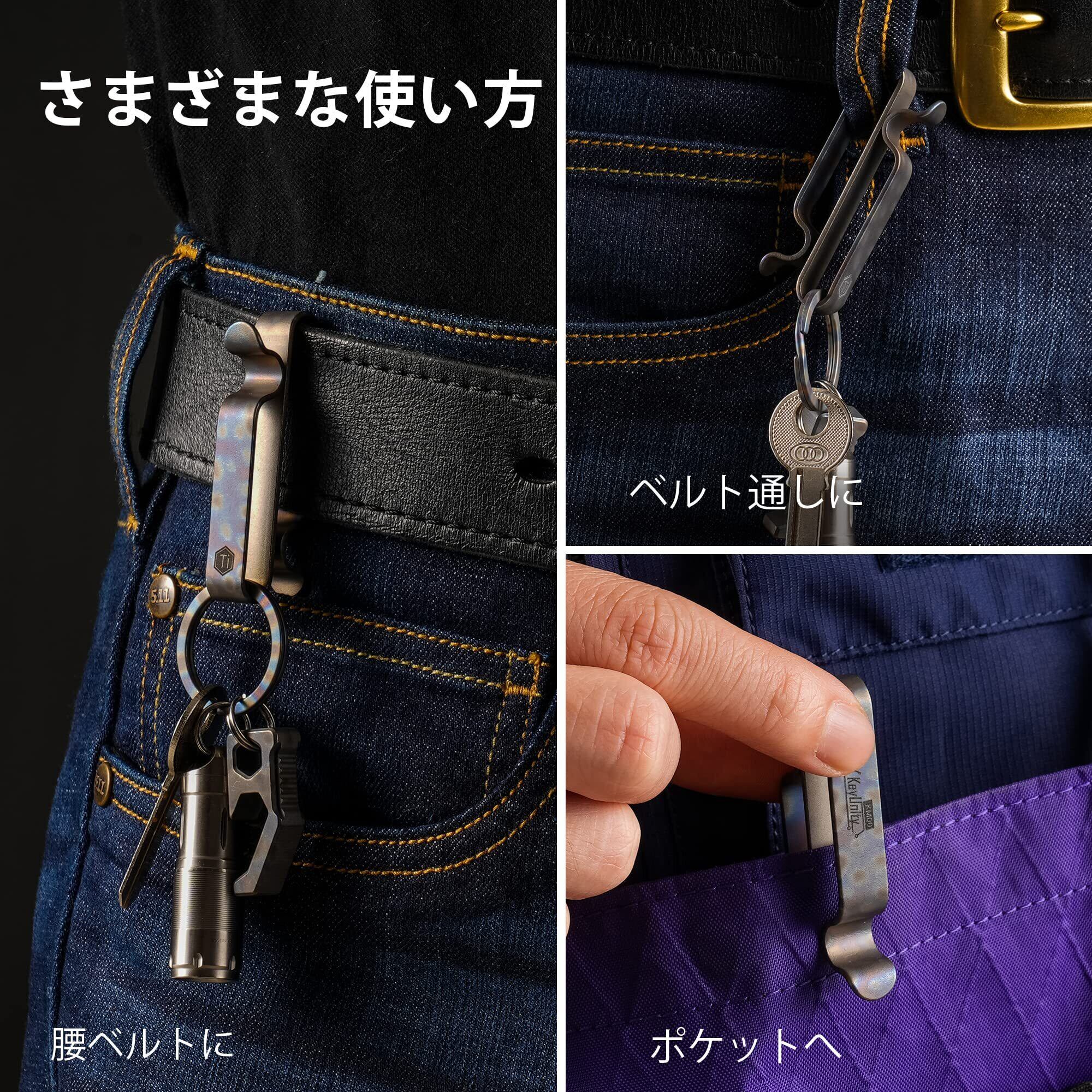 【3wayの使い方】チタンキーホルダーは、「ベルトにかける」、「ベルトループにかける」、「そのままズボンをはさむ」といった3通りの使い方ができます。ベルト、ポケットとリュックサックに掛けやすくなっています。