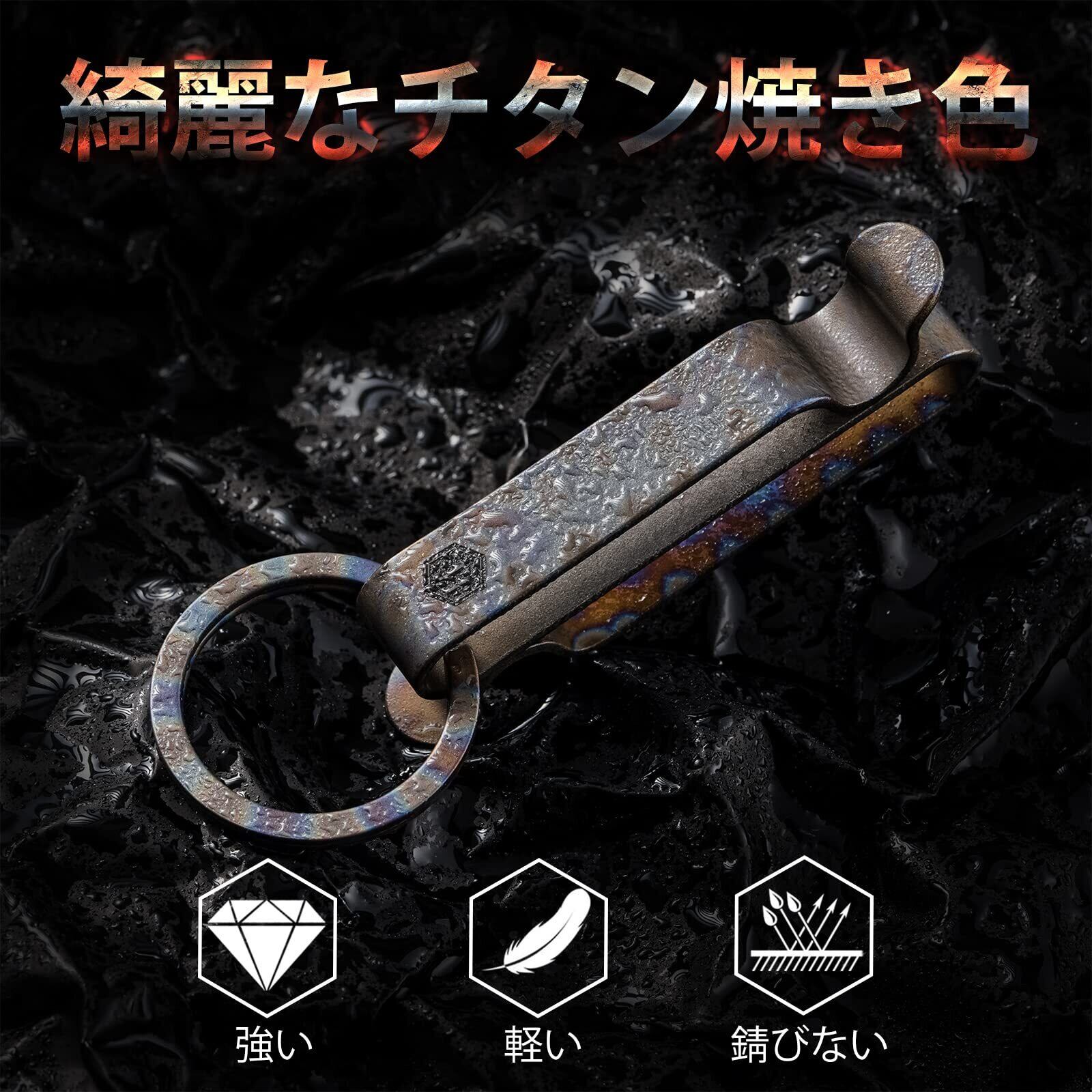 【防水性、防腐食性、使用寿命性】KM00チタンキーホルダーの特徴として錆びにくいことが挙げられます。ステンレスよりもさびにくく、海水耐食性はプラチナに次ぐ強さを誇ります。こちらのチタンキーホルダーはバネを使用しないシームレスな構造となっております。接続リングとキーリングは簡単に脱着可能なため様々なアレンジで使用可能です。そのため、長期にわたり使用することが可能なキーホルダーとなっています。