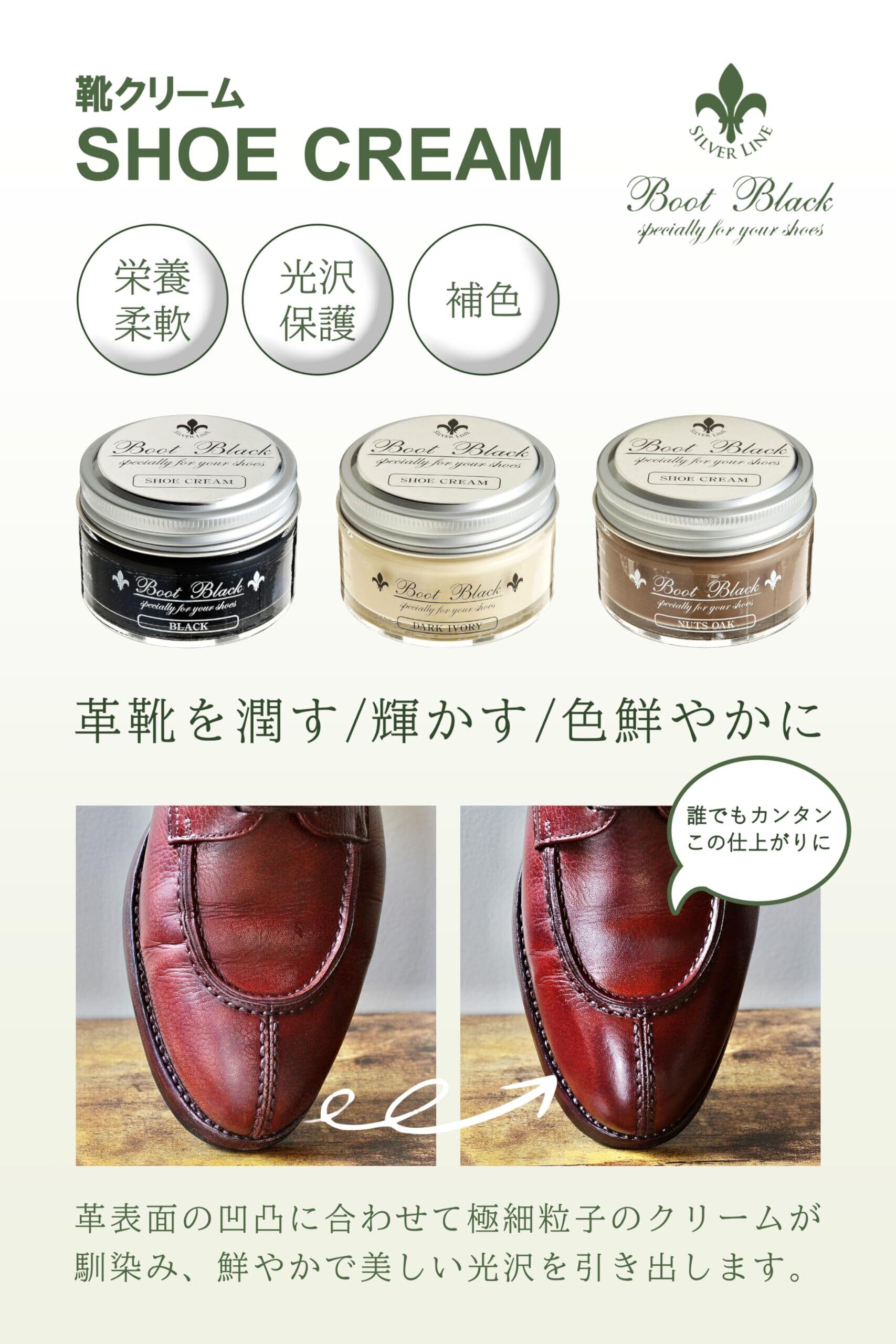 靴磨きの<プロ>が創り上げた靴クリーム。クリームの伸び、拭き取りの軽さ(布の走り)などの使いやすさと、皮革への優しさを追求した基礎シューケア用品です。90年以上の歴史が育んだワックスブレンド技術を活かした処方による光沢、保革はもちろん、磨き感に優れたシュークリームです。微結晶で特有の粘りのあるミツロウと、硬く高光沢の鉱物系ワックスが皮革表面に密着した滑らかなツヤを与えます。また、皮革内部にゆっくりと浸透するミネラルオイルを配合しましたので、優れた保革効果を与えます。55g入り