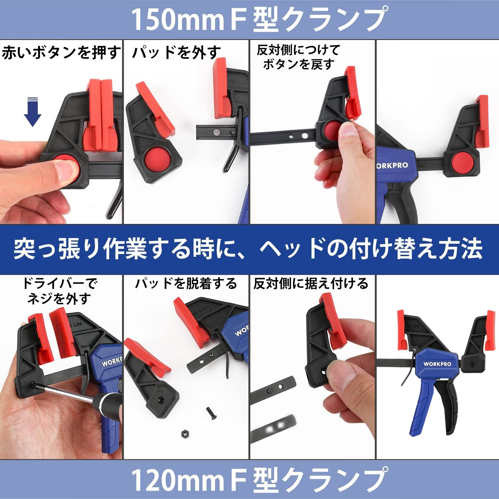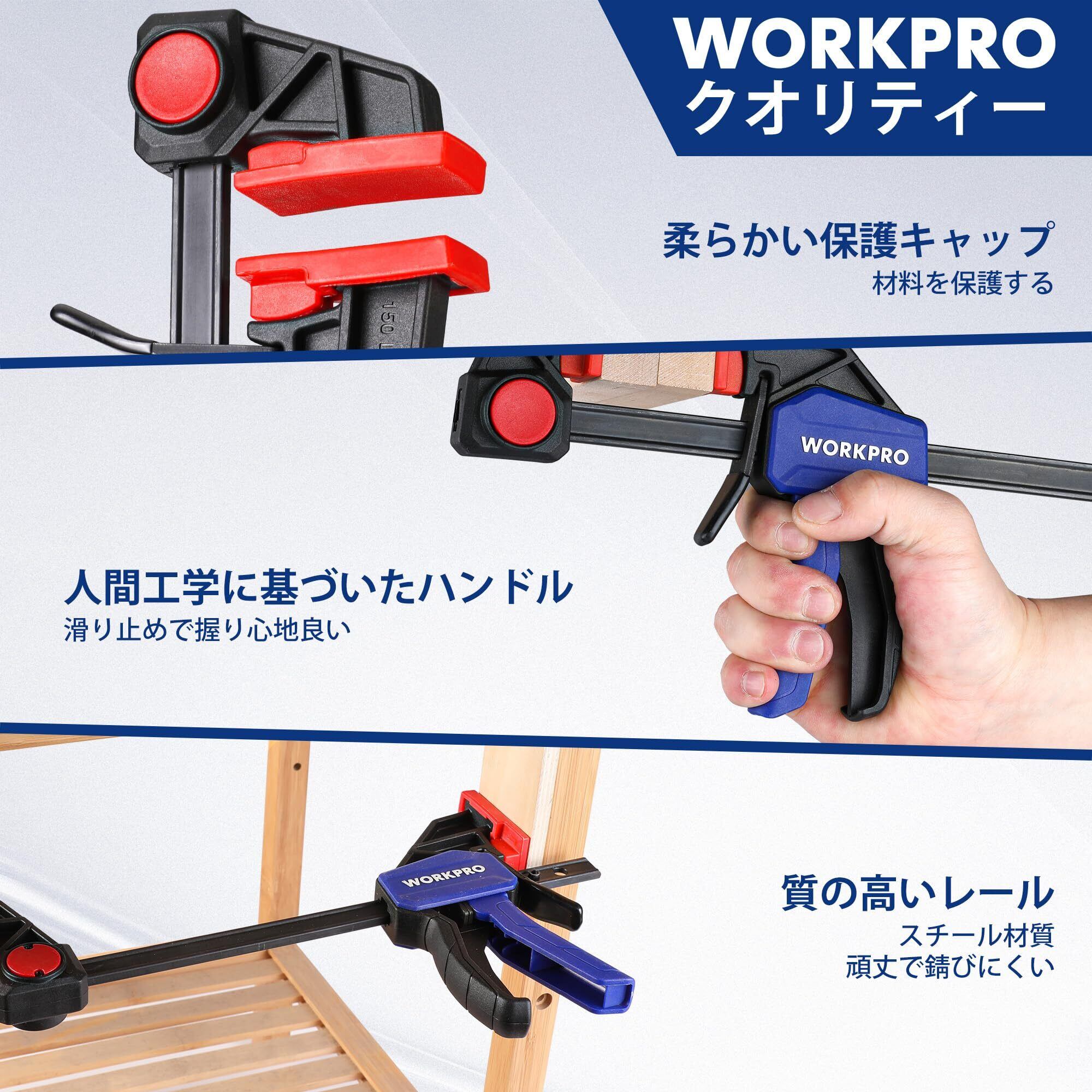 WORKPRO クランプ Fクランプ クイックバークランプ 120mm&150mm 4本組 最大締付力約23kg&68kg 1セット2役 クイックリリースレバー 滑り止め 樹脂保護パッド付き 木工作業 木材 強力固定 接着 溶接 切削 DIY工具