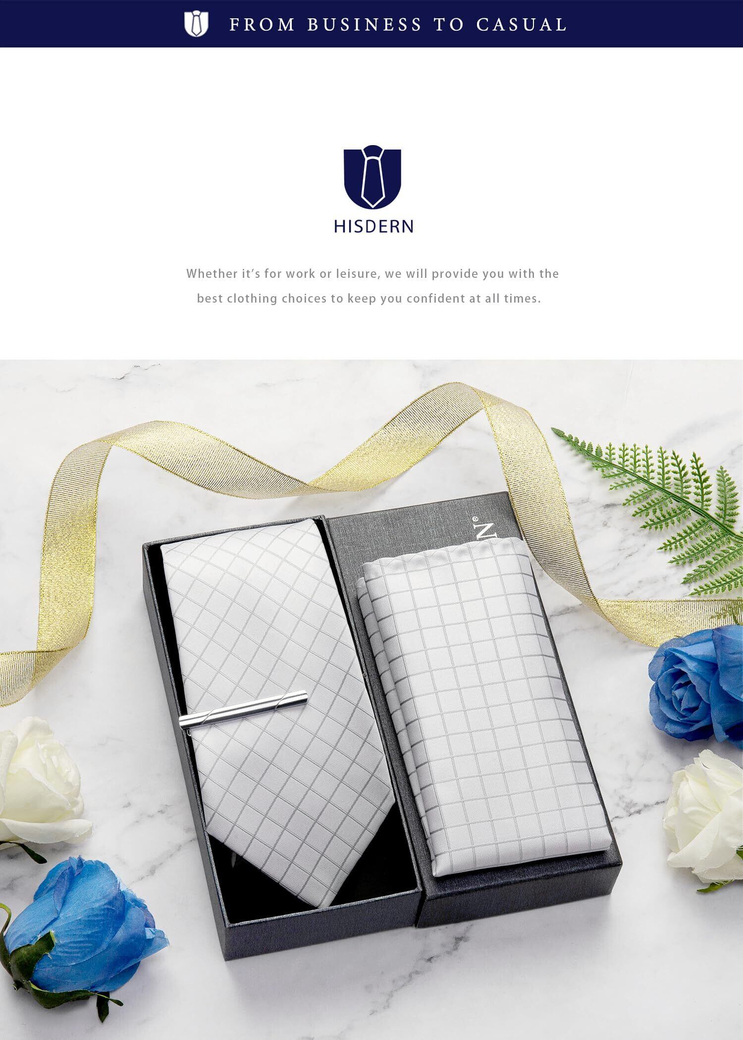 【3点セット】ネクタイ1本 + ポケットチーフ1本 + ネクタイピン1本 、HISDERNブランド専用ボックスが付き 商品サイズ:ネクタイ 幅8.5cm / 長さ150cm | ポケットチーフ: 31cm*31cm | ネクタイピン:5.8cm × 0.6cm。