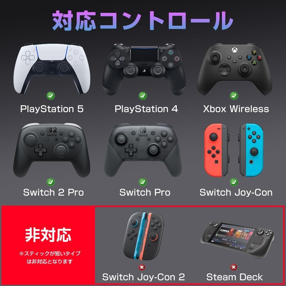 【対応機種】多機種のコントローラー適用するタイプなので、PS5/PS4/PS3/SWITCHプロコン/Xbox ONE/Switch Joy-con / Switch OLED / Switch lite /など様々なコントローラーに適用します。※ご注意:VR/Steam Deckには適用していません。※Switch Joy-Con 2などのスティックが短いタイプは非対応となります。