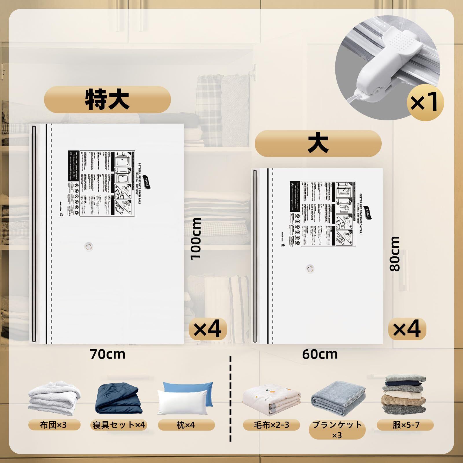 スペースの節約:サイズ:特大100*70cm(4枚)、大80*60cm(4枚)衣類圧縮袋は家庭の保管問題の解決に最適です。真空圧縮技術により、衣類、寝具、掛け布団、毛布、ぬいぐるみ、枕などをしっかりと圧縮することができます。ワードローブやスーツケースをより整理整頓します