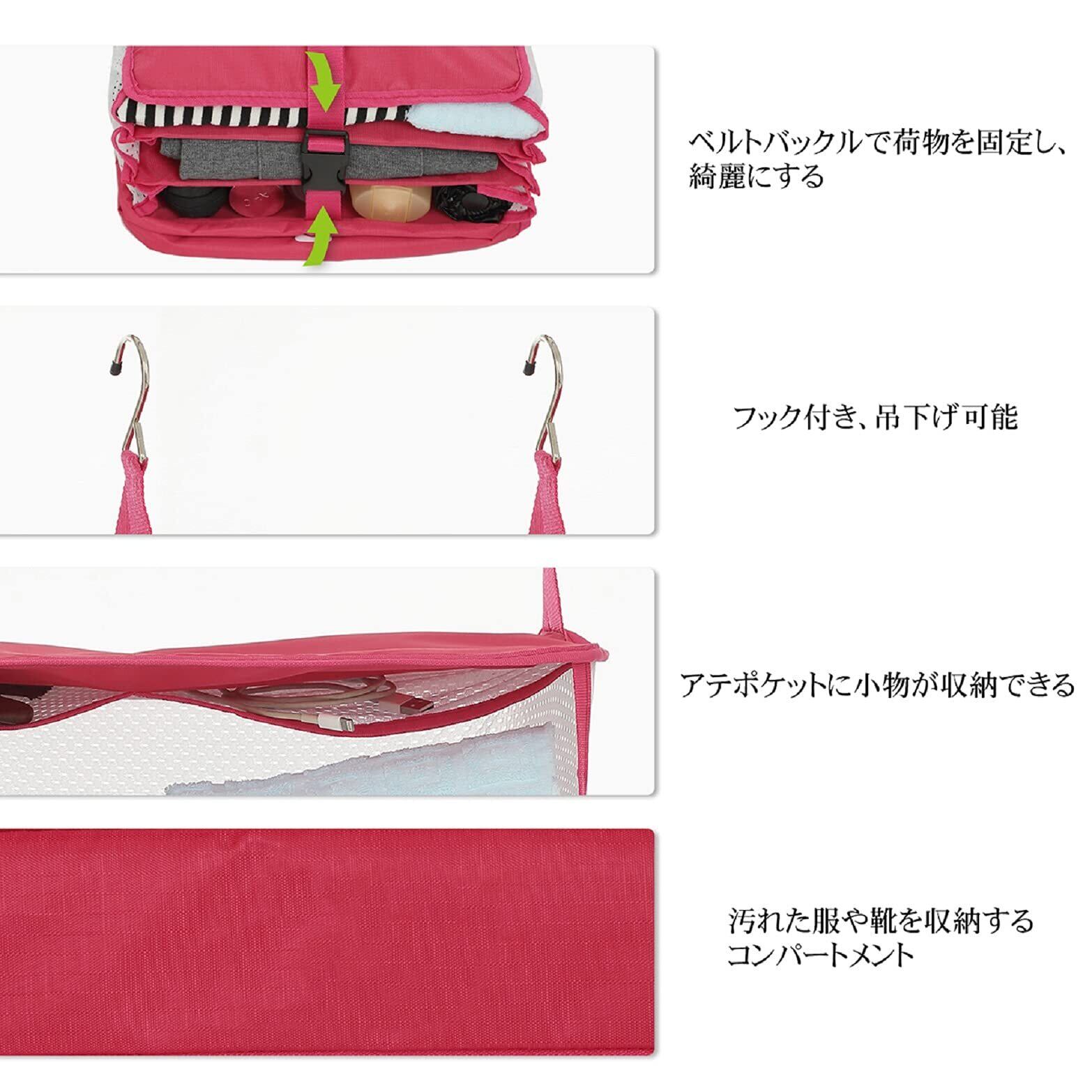 【素材】ポリエステル 【カラー】ブラック ブルー グレー ローズ カチオングレー 【吊り下げサイズ】Lサイズ:30*30*61CM XLサイズ:45*30*62CM 【荷物を入れた収納サイズ】Lサイズ:30*30*13CM XLサイズ:45*30*13CM 【不使用時の折畳みサイズ】Lサイズ:30*30*4CM XLサイズ:45*30*4CM