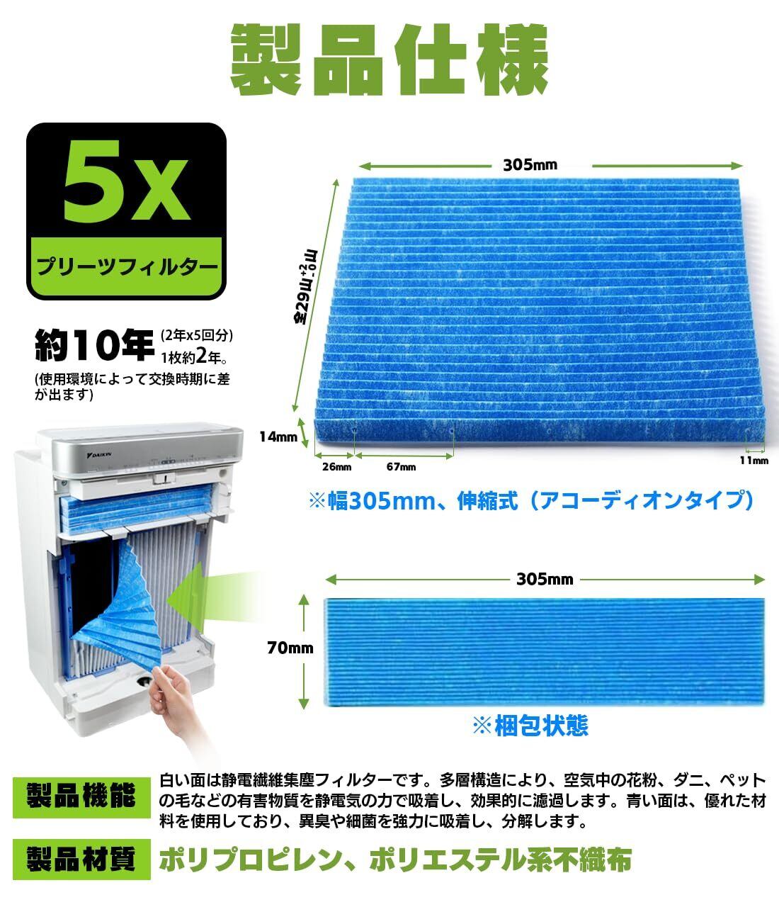 MSHNE ダイキン空気清浄機交換用フィルター プリーツフィルター KAC017A4/KAC006A4の後継品にご対応 互換品(5枚入)