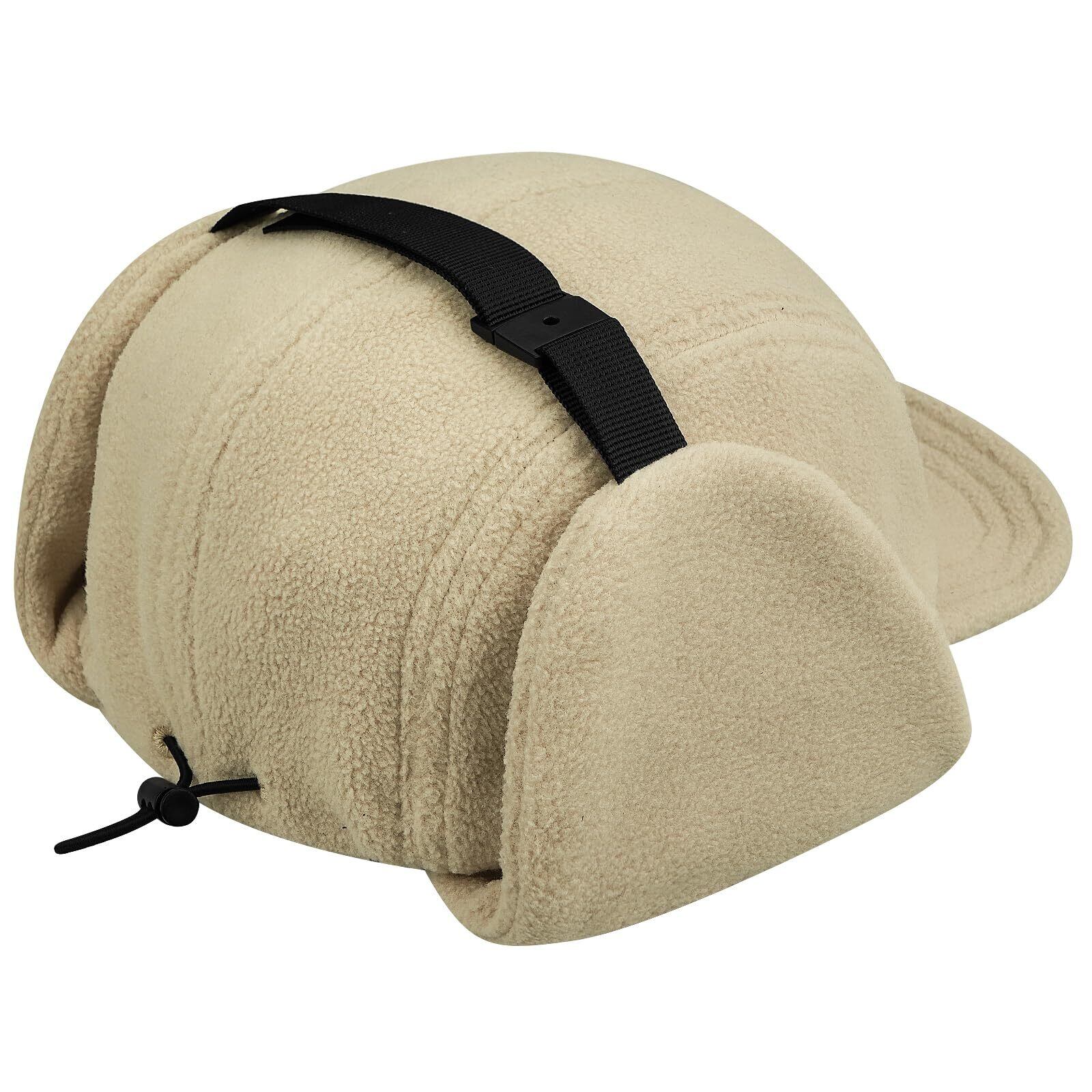 サイズは55-58 cmで、ほとんどの人に合う長さ調整可能なあごベルト付き。帽子自体の高さは約12cm、耳あての長さは約13cm、つばの長さは約5cmです。