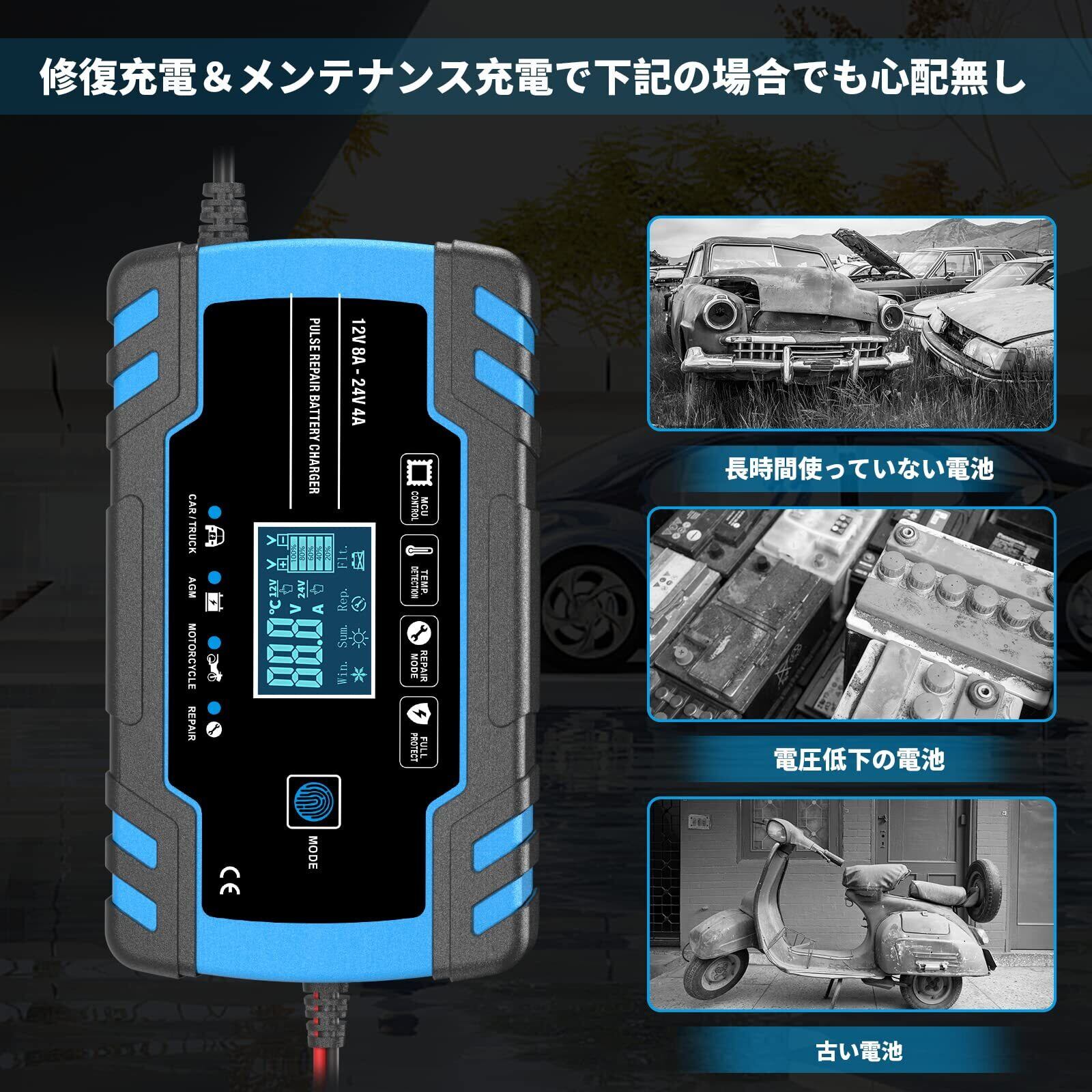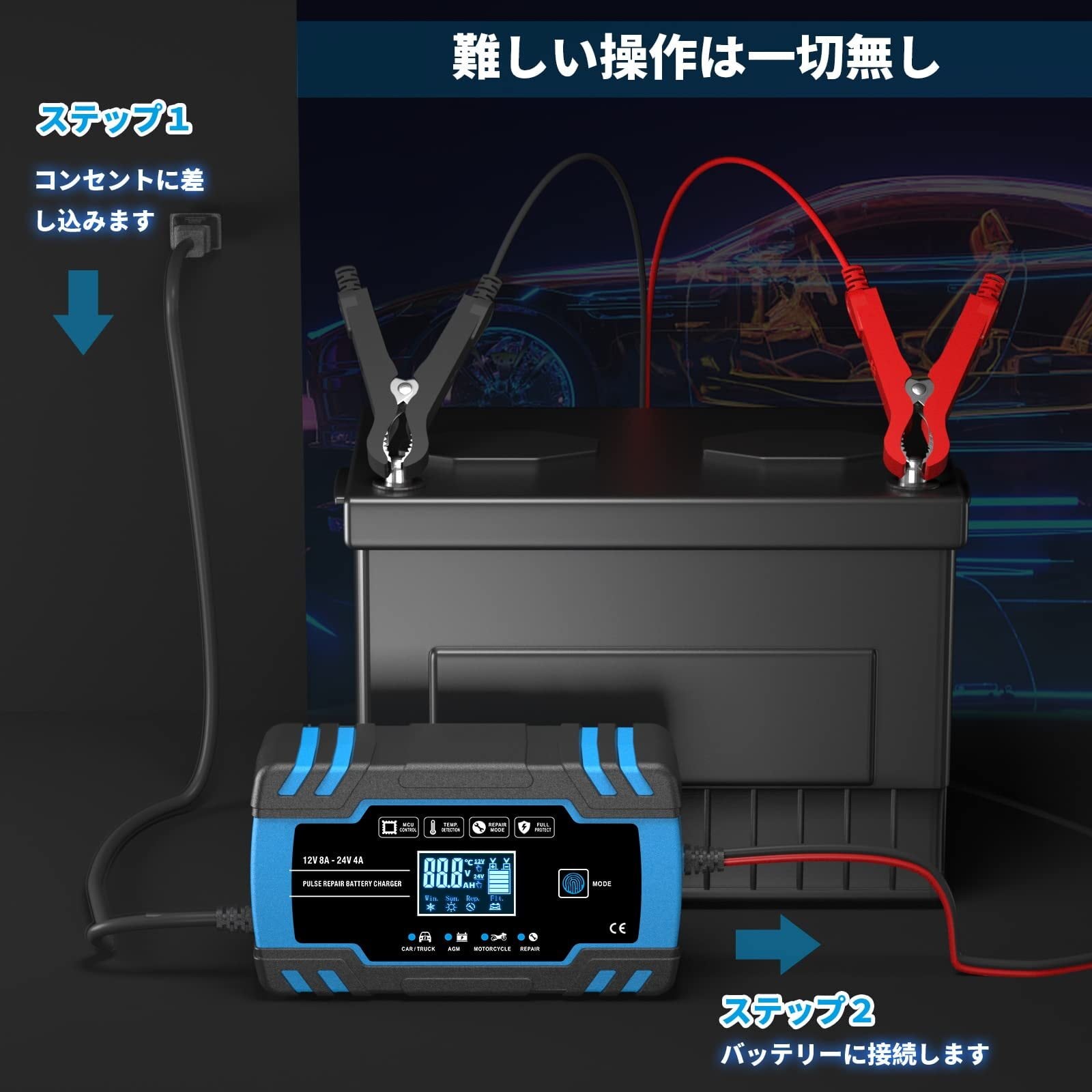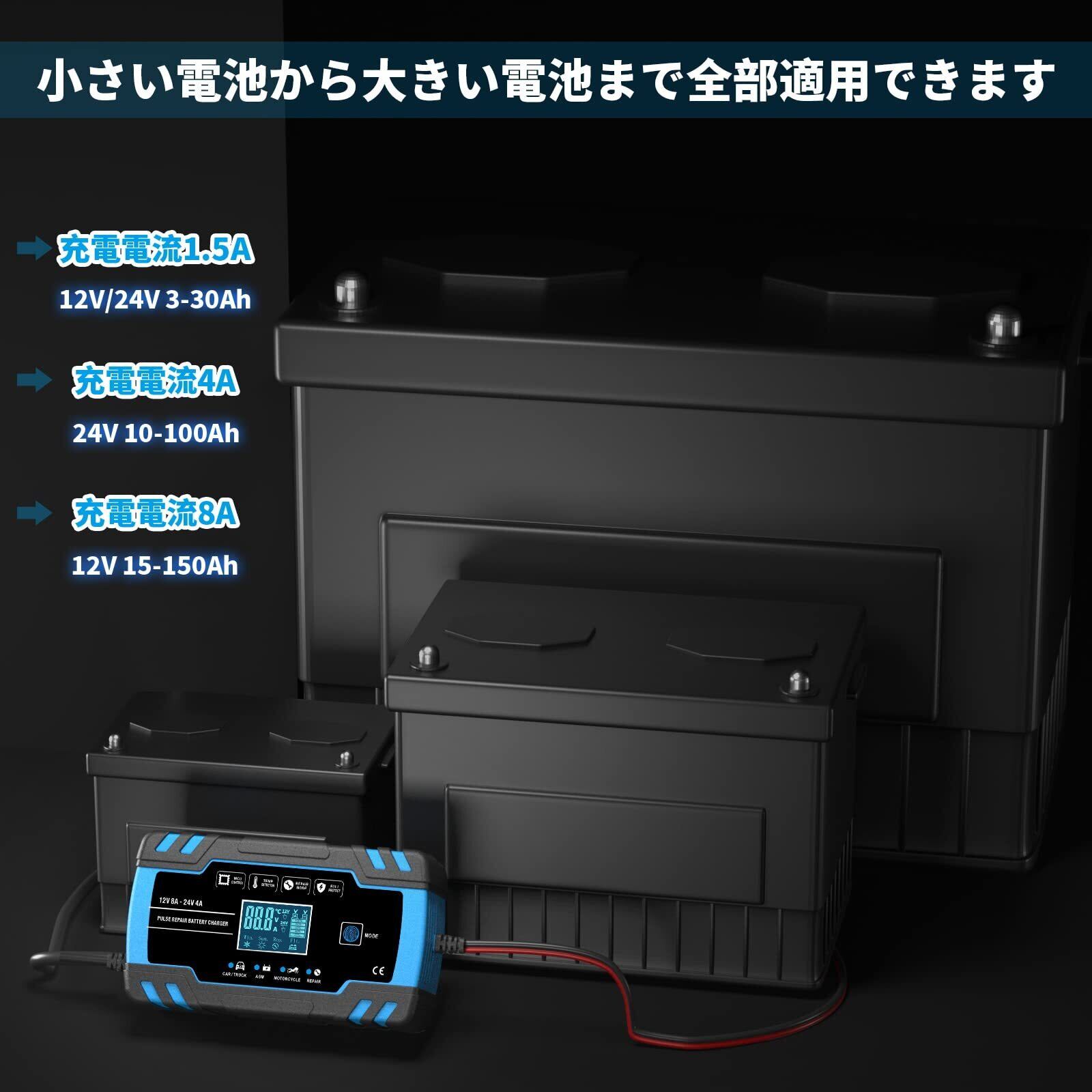 AUTOWHD 12Vと24V用鉛蓄バッテリー充電器 全自動バッテリーチャージャー 修復充電機 パルス充電 1.5A/4A/8A充電電流 トリクル充電 3-150Ah用LCD表示 自動車&バイク&トラック等適用 日本語説明書 | hananoki