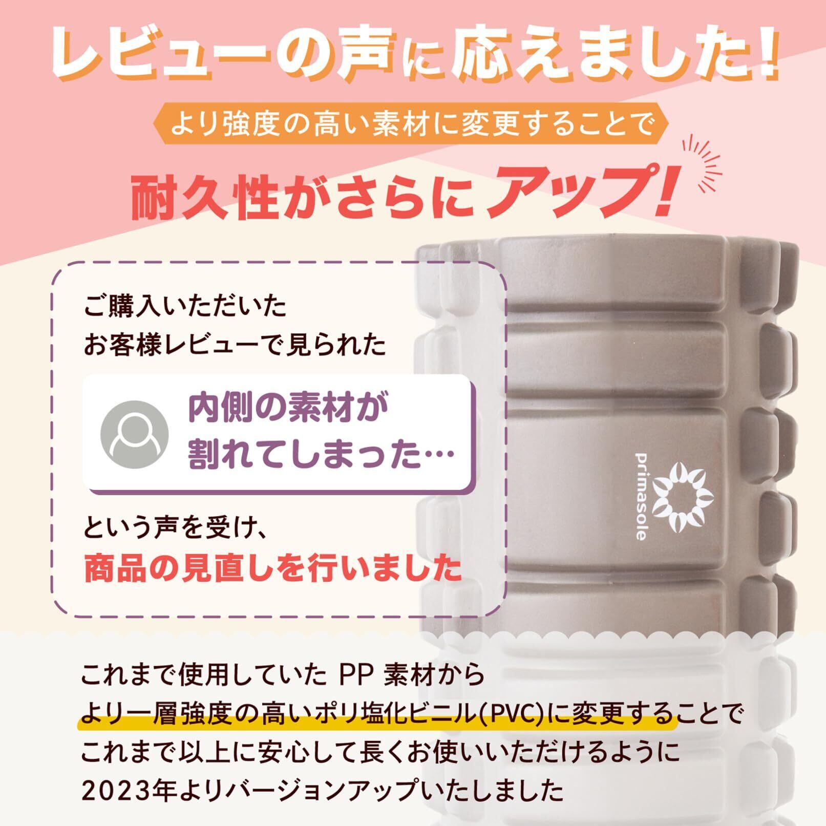 芯材が割れやすいとお客様より声がありPPからより体重をかけても変形しにくく耐久性の高いPVC素材に変更。耐荷重200kgなので誰でも安心してお使いいただけます。よりしっかりと筋肉を解します