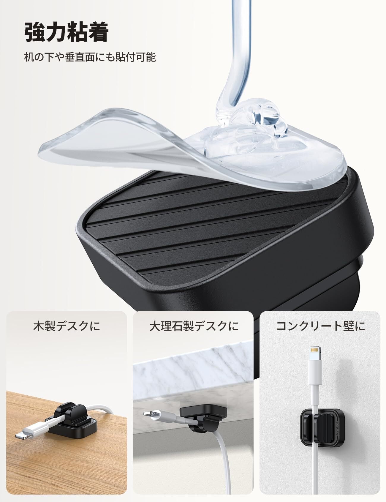 【強力粘着・両面テープ】強力な両面テープを使用して、木製やガラス製、プラスチック製や大理石などの色々な材質に対応でき、剝がれ落ちる心配はありません。卓上や机の裏のような場所の他、家具の側面、車内などの垂直面にもケーブルをすっきり固定できます。注意しっかり貼り付けるため、きれいにしたフラットな所に貼った方がいいです。しっくい塗りの壁に貼るのはお勧めしません。車内に利用するならなるべく直射日光を避けてください。取り付け後、粘着力をより安定するために、ご使用の前に24時間をお待ちください。