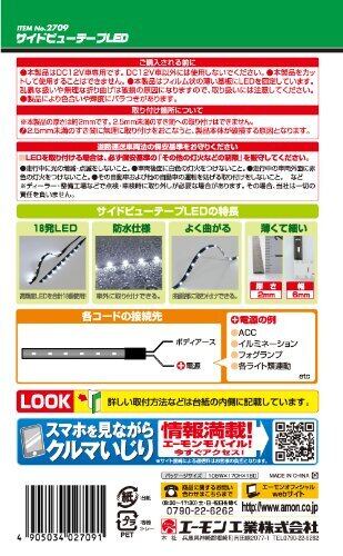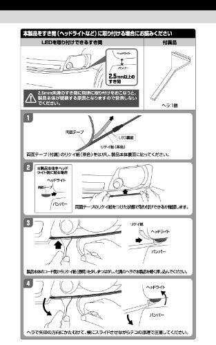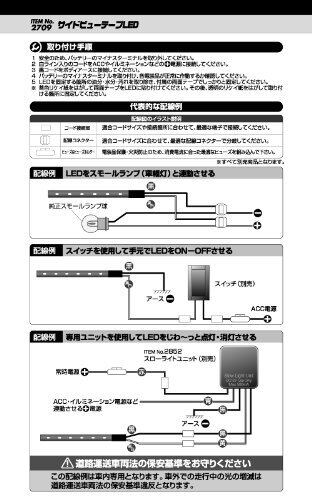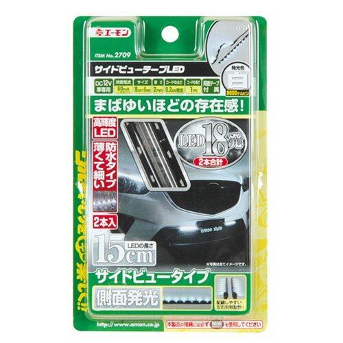 【仕様】発光色:白 8000ケルビン(1本につきLED9個配置) ・DC12V車専用 ・消費電流:60mA(1本あたり) ・コードサイズ:0.2sq相当-約1m ・両面テープ付属 ・入数:2本