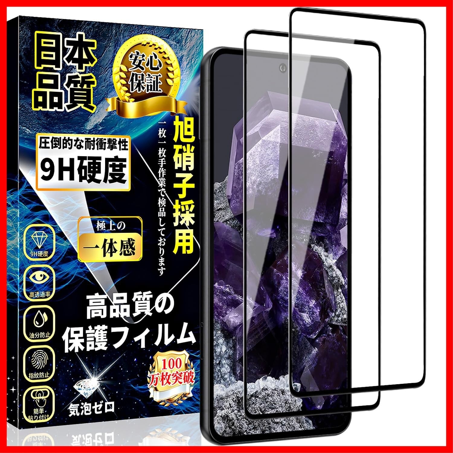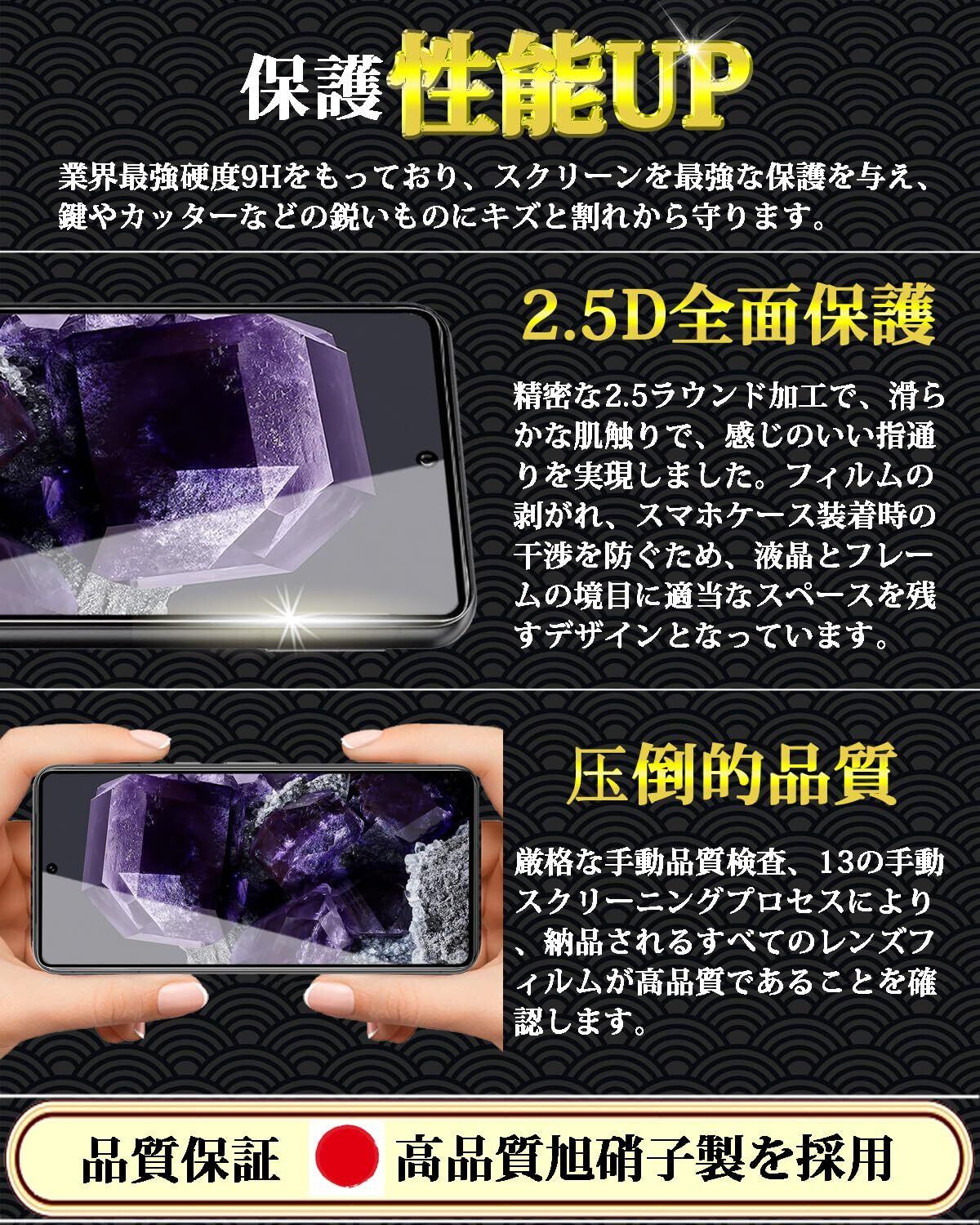 特徴 全面保護,9H表面硬度,飛散防止,防指紋,撥油コーティング,撥水剤,耐衝撃性,ラウンドエッジ,気泡なし,高透過率,簡単貼り付け