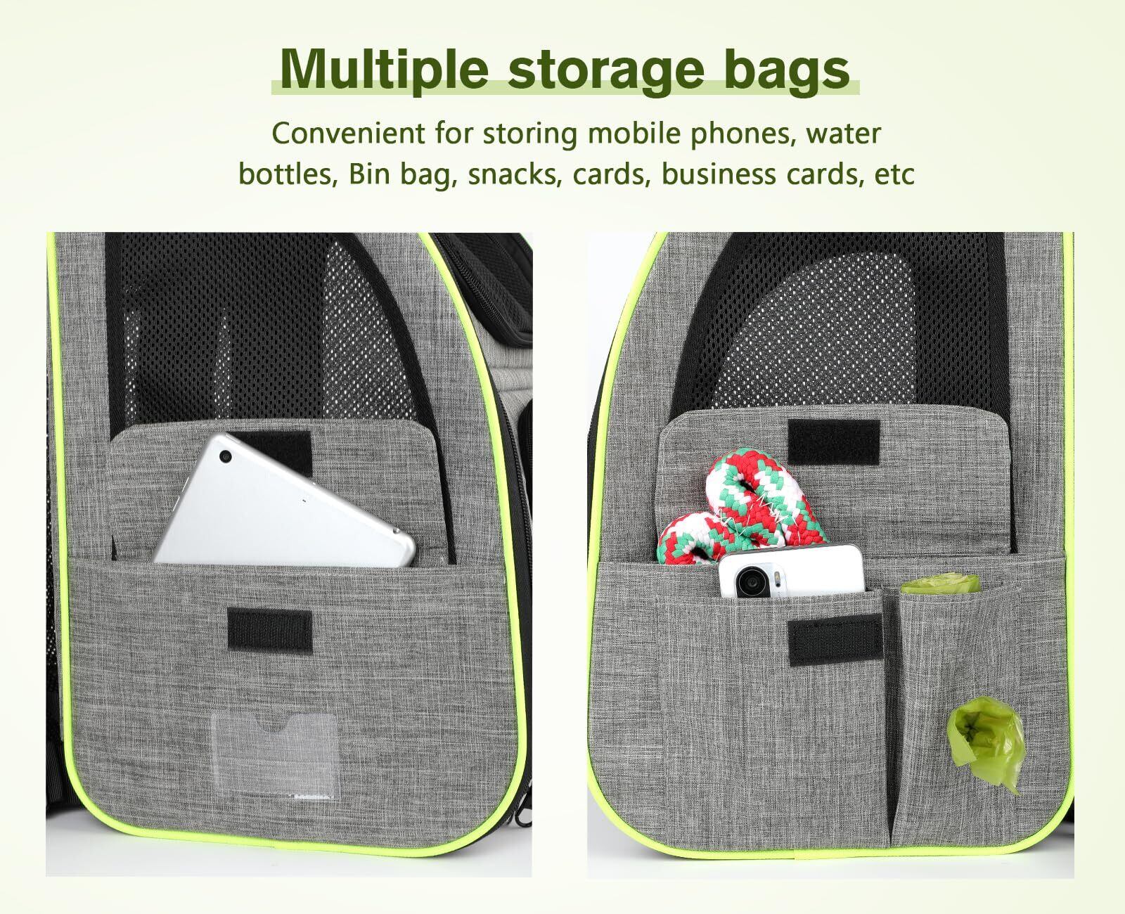 【高品質の素材と収納ポケット】耐傷性がある高品質のナイロン生地を使用しており、バックパックにはスチールワイヤーフレームがあるため、安定性を確保し、崩れにくくなっています。さらに、バックパックには両側に複数の収納ポケットがあり、ゴミ袋や水筒などの必要なペット用品、スマートフォンや財布などの個人用品を収納できます。