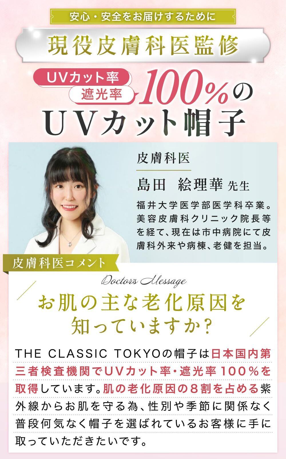 東京発のUVケアブランド「THE CLASSIC TOKYO」の現役皮膚科医監修UVカット率100%エレガントハットです。 UVカット100%に徹底的にこだわり、国内第三者検査機関にてUVカット率100%・遮光率100%の認証を取得致しました。(JIS規格1925,JIS規格1055) 1年中降り注ぐ紫外線からお肌をガードするだけでなく、お子様とのお出かけやアウトドアライフに欠かせないおしゃれアイテムとしてぜひお手に取っていただけますと幸いでございます。