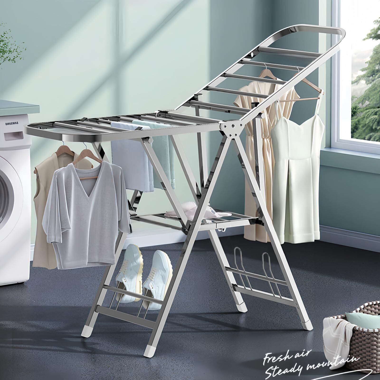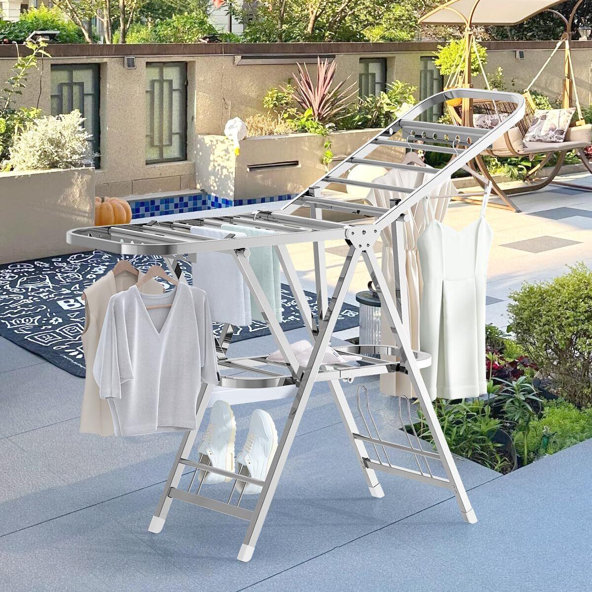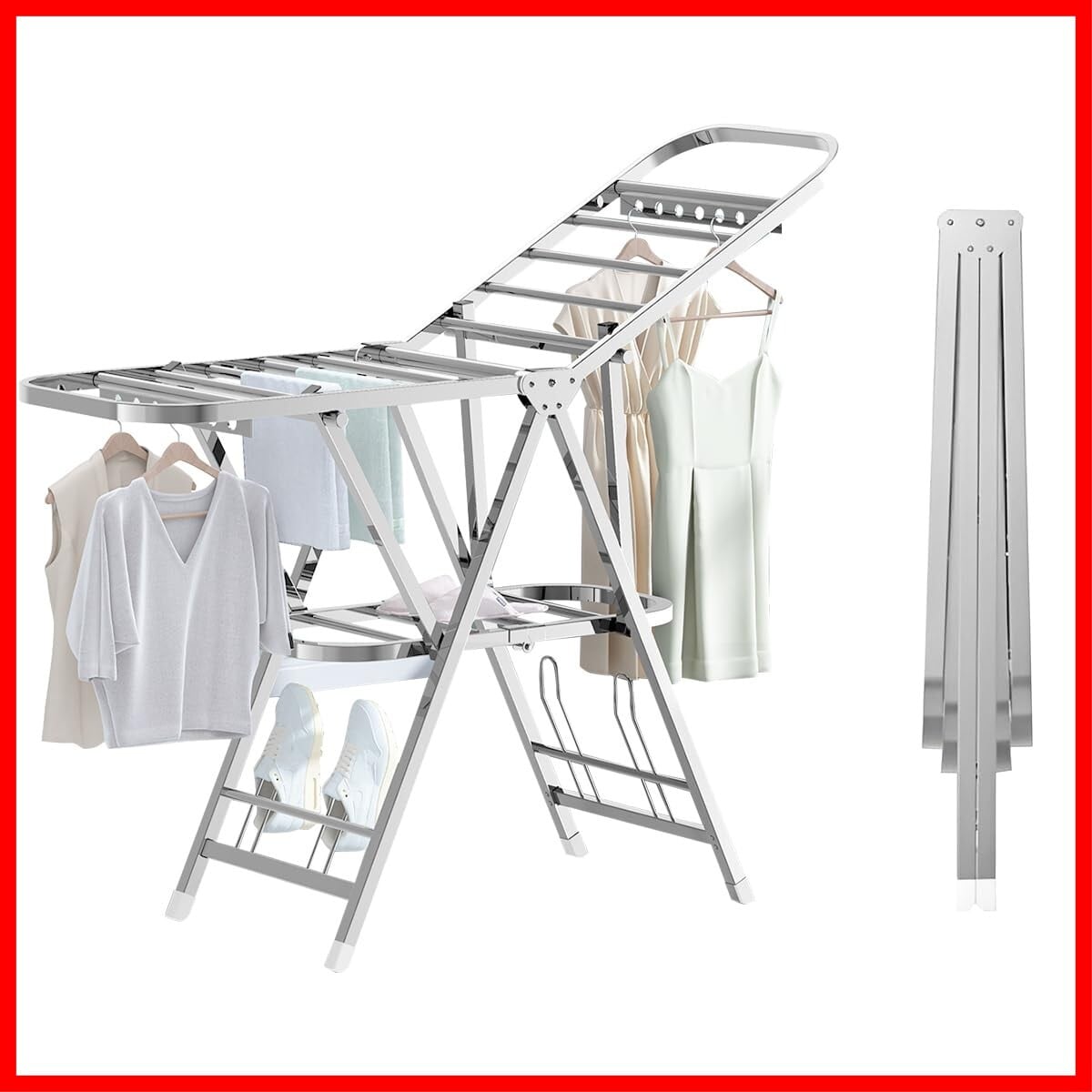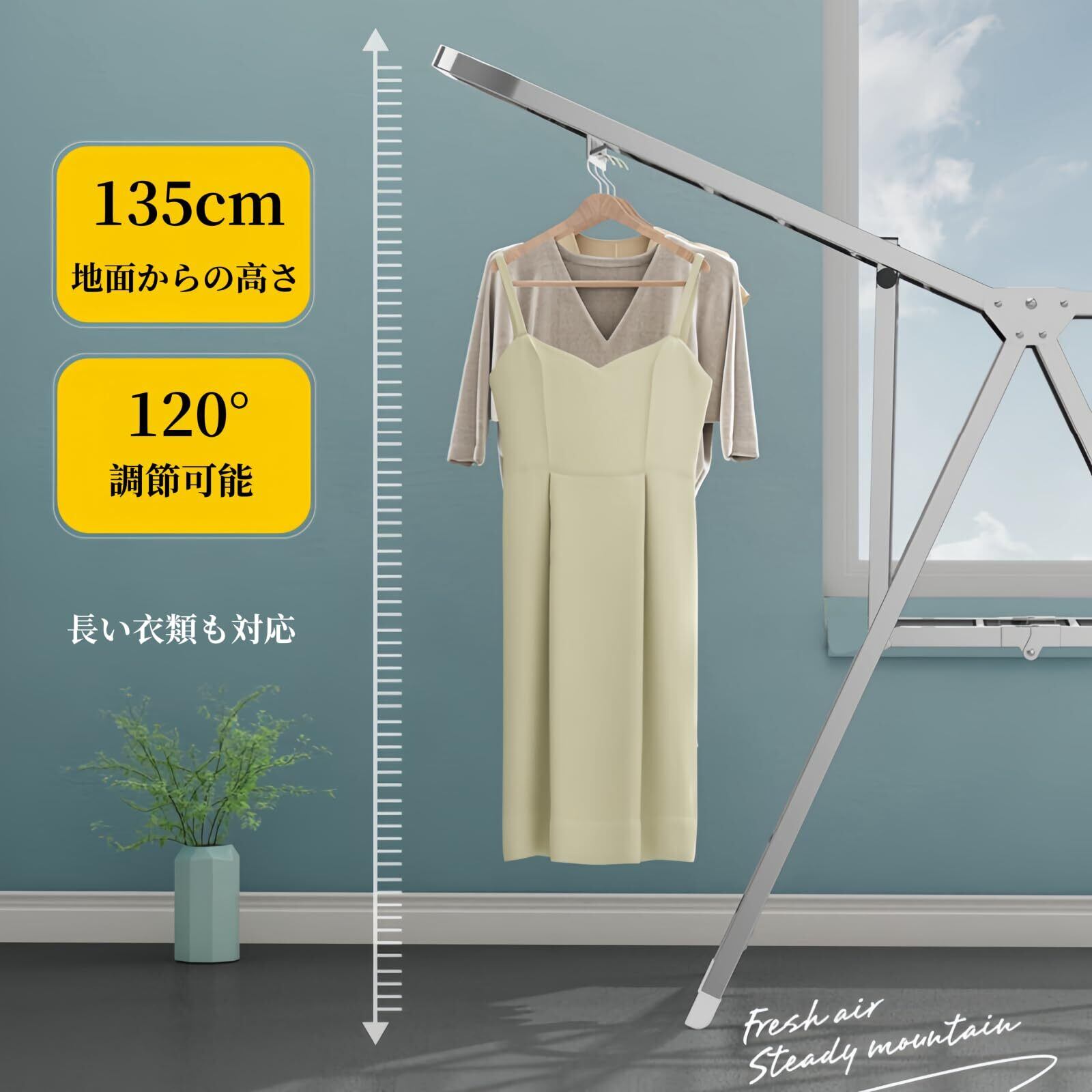 【高さ調節可能】両翼は高さ調節可能なので、シャツ、タオルはもちろん、丈の長いワンピースやコートなどでも掛けられます。靴掛けと靴下干し用クリップが付きます。