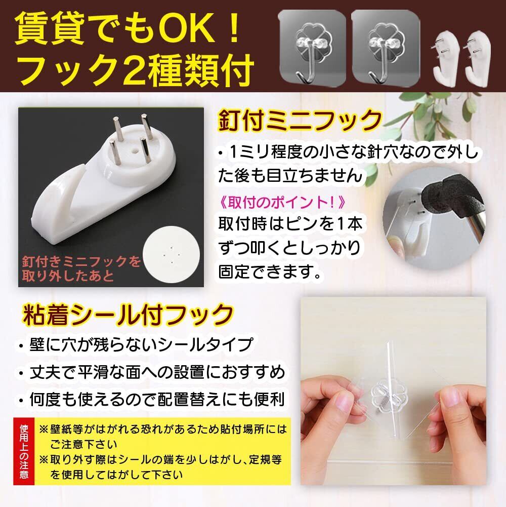 賃貸もOK!設置に便利な2種類のフック付!釘付フック2個と粘着シール付フック2個が付属します。