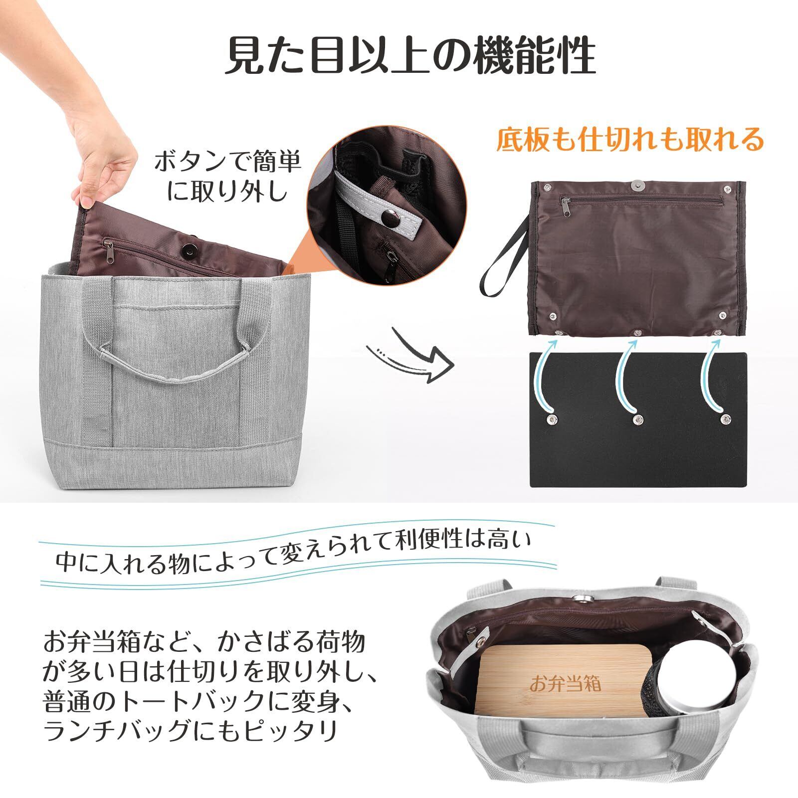【見た目以上の収納力と機能性】コンパクトだけど収納スペースにはペットボトルが立てて収納できたり、長財布はもちろん、B5サイズノートも収納可能なレディース/メンズ トートバッグです。またお弁当箱など、かさばる荷物が多い日は仕切りを取り外して、普通のトートバッグに変身、ランチバッグにもピッタリです。さらに底板付きで多くの荷物を入れても安定して自立します。