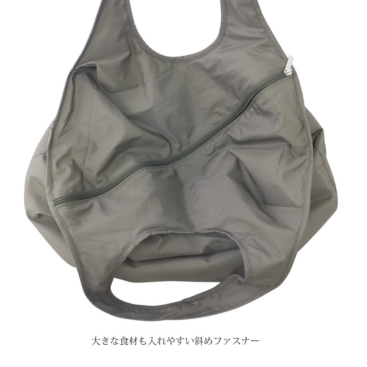 出し入れしやすい斜めファスナー式の入れ口を採用しています。持ち手が長いので肩にもかけられ、重い荷物もらくらく。大きめのマチで、お肉等のトレーも入れやすい設計です。レジカゴに合うサイズで、内側側面のベルトをセットすると荷物が入れやすい仕様になっています。