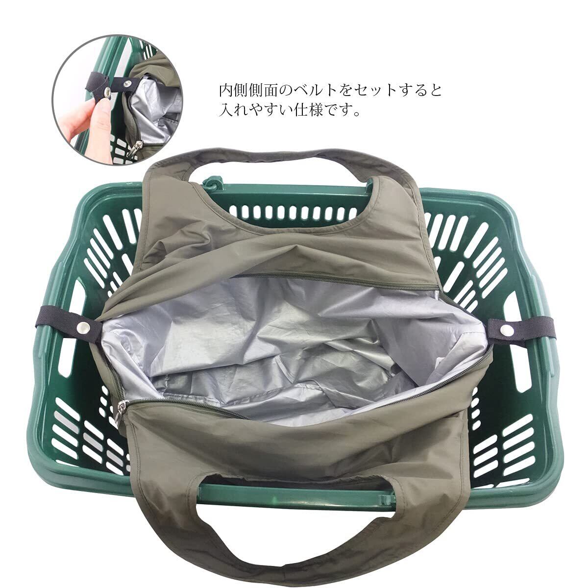 レジカゴに合うサイズで、内側側面のベルトをセットすると荷物が入れやすい仕様に。
