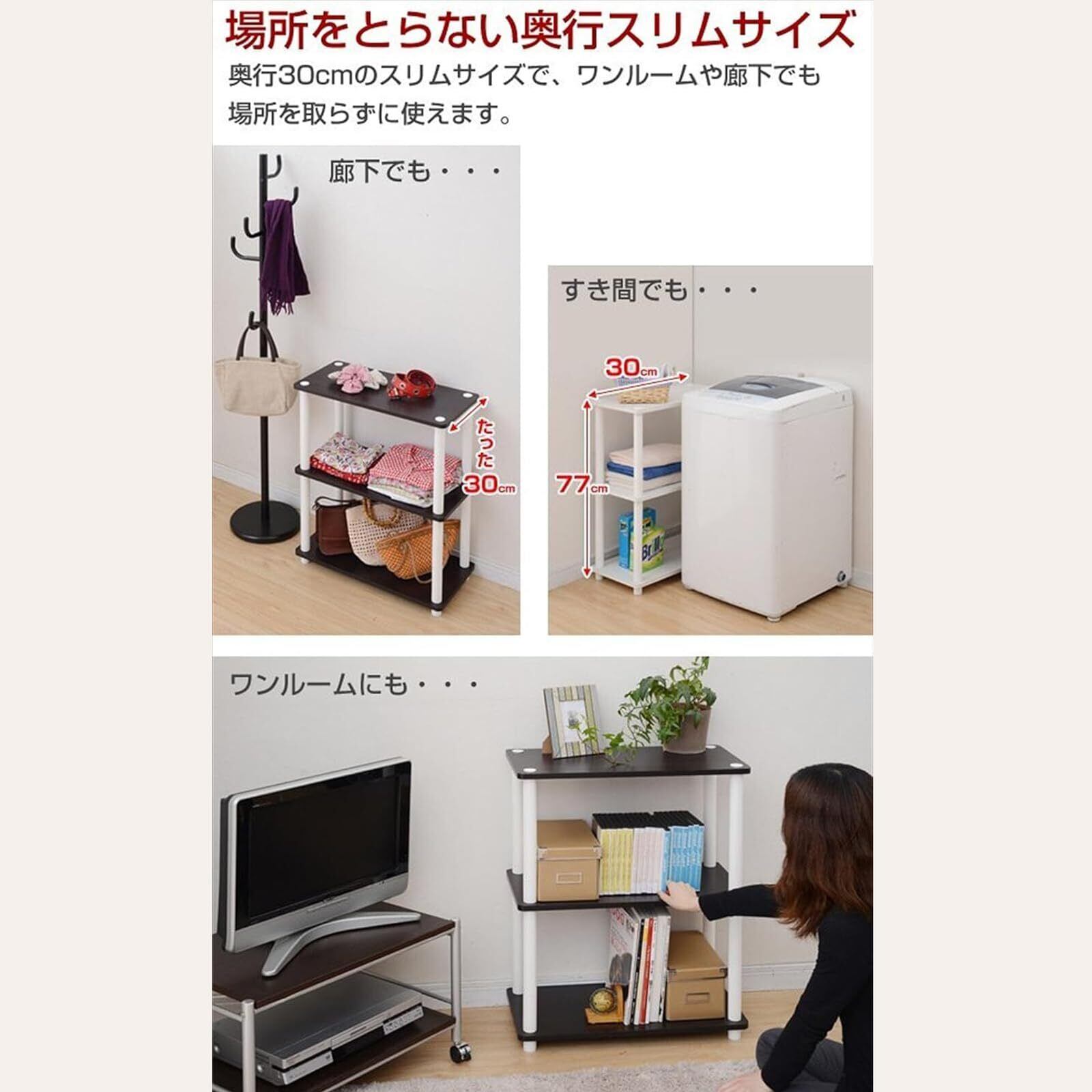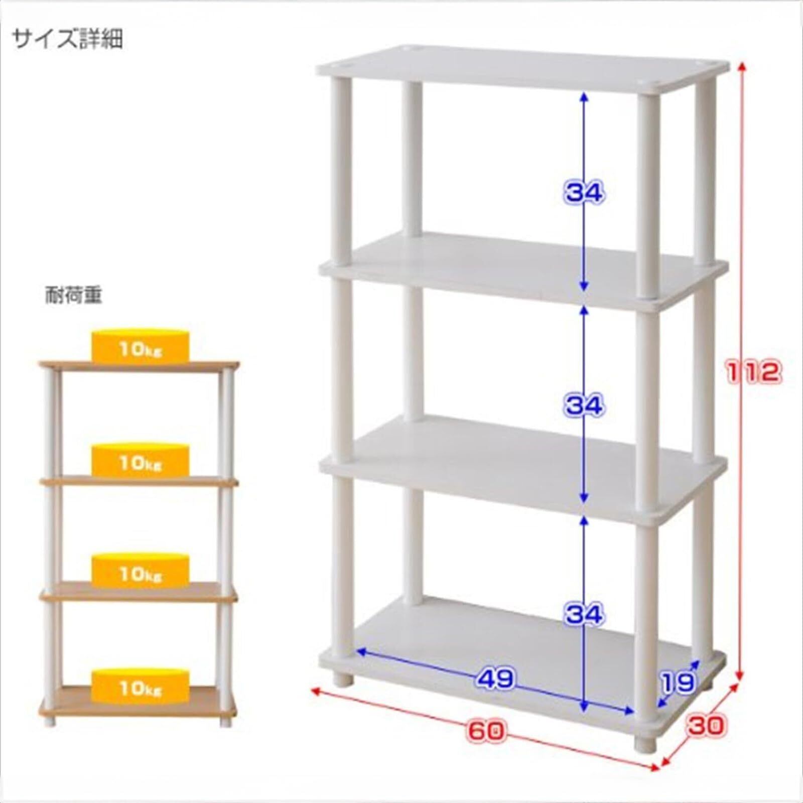 ●組立品です●組立時間:約10-20分●工具不要の組立て簡単ラック●狭い場所でも活躍する奥行き30cmのスリムなデザイン●縦向きに隙間ラックとして、脱衣所などでも活躍●様々な場所で使えるマルチなラック●棚の角が丸い安心デザイン●全体耐荷重:40kg●棚板耐荷重:10kg●棚板有効内寸:幅49 奥行19 高さ34cm●支柱直径:約3cm●床~下段棚までの高さ:3.5cm
