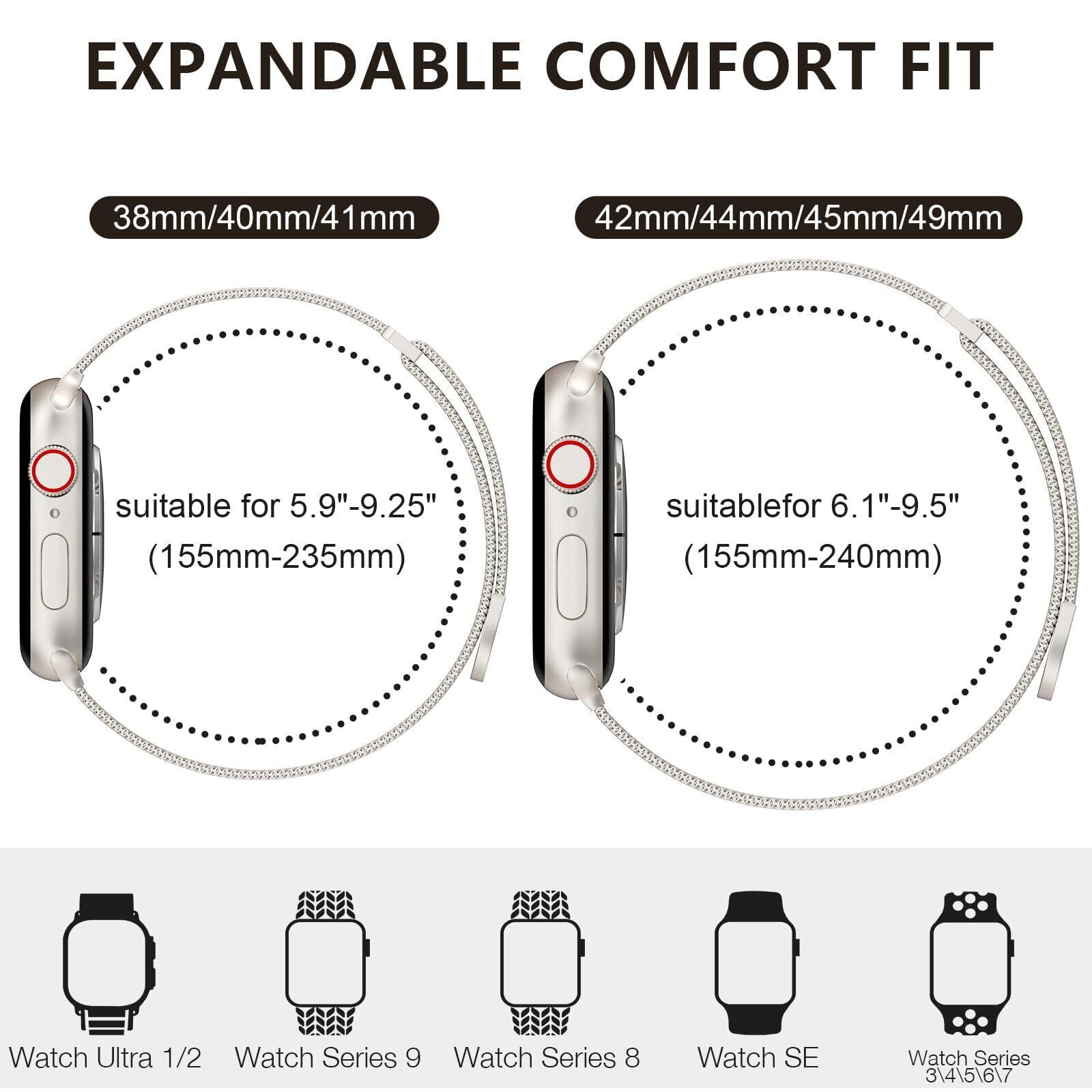 ANYOGROコンパチブルApple Watchバンド レディースの全シリーズに対応!Series 10/9/8/7/6/5/4/3/2/1/Ultra/Ultra 2/SEモデルまで、49mm/46mm/45mm/44mm/42mm/41mm/40mm/38mmまでの幅広いサイズに対応しています。どんな手首サイズにもぴったりフィットし、男女兼用デザインで、日常からビジネス、カジュアルシーンまで、様々な場面で活躍します。購入前にサイズをご確認ください。