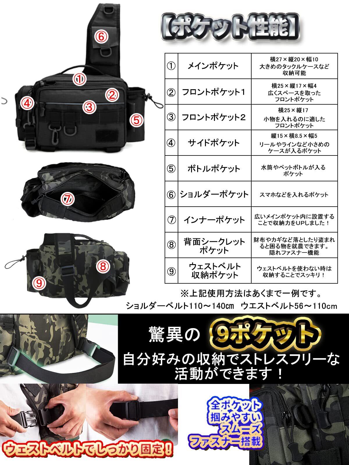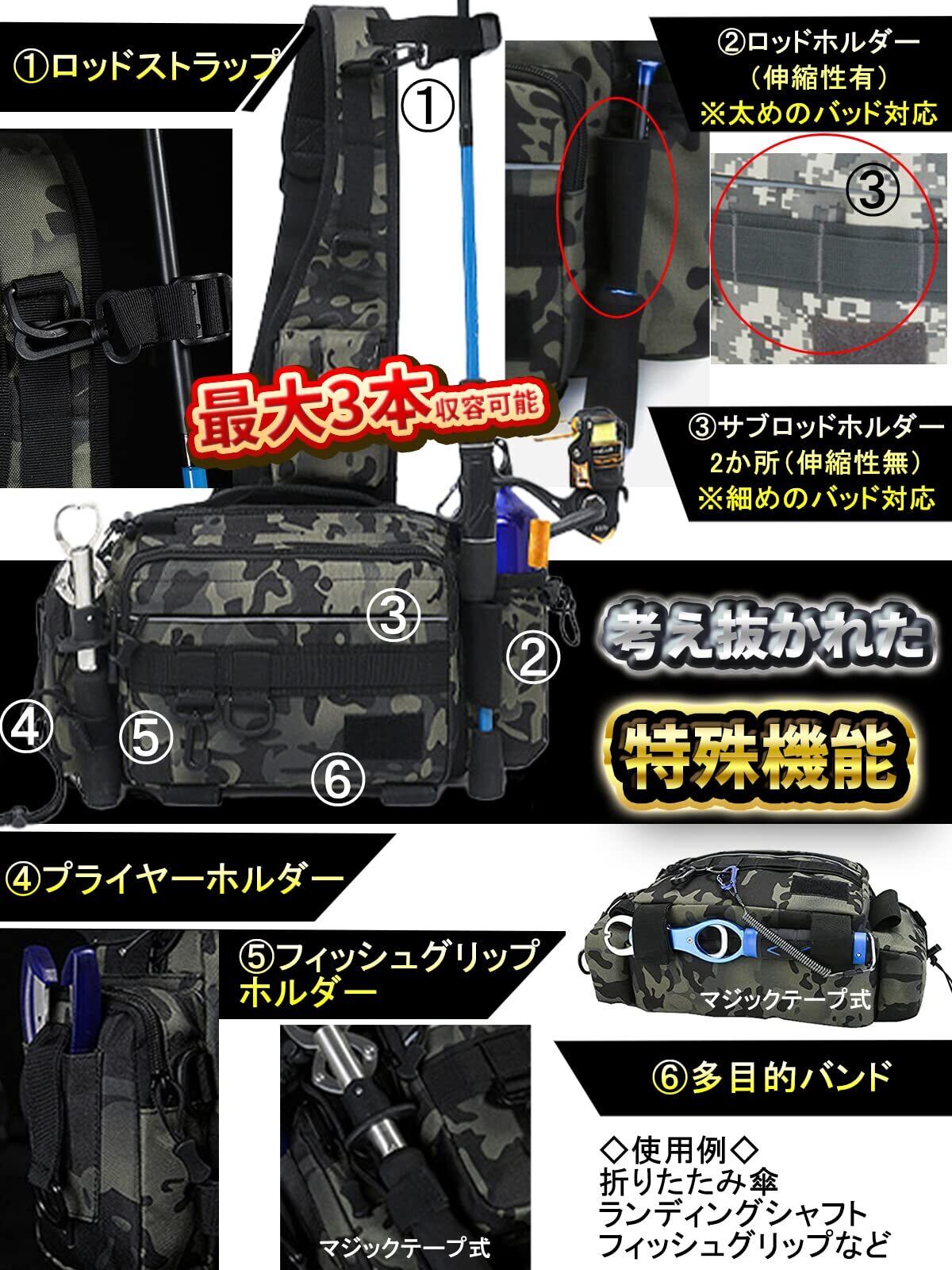 【商品説明】釣りを主に、アウトドアシーンでの使用を最大限に生かす設計のショルダーバッグです。ショルダーバッグとしてはもちろん、ハンドバッグやウエストベルトが付属しているため安定した持ち運びを可能にしたバッグです。ロッドホルダー付き(取り外し可)でフィッシングシーンでのスムーズな移動やラン&ガンの実現を可能にしたバッグです。ボトルホルダーが設計されているのでストレスなくドリンクを持ち運び事ができ熱中症対策が可能です。