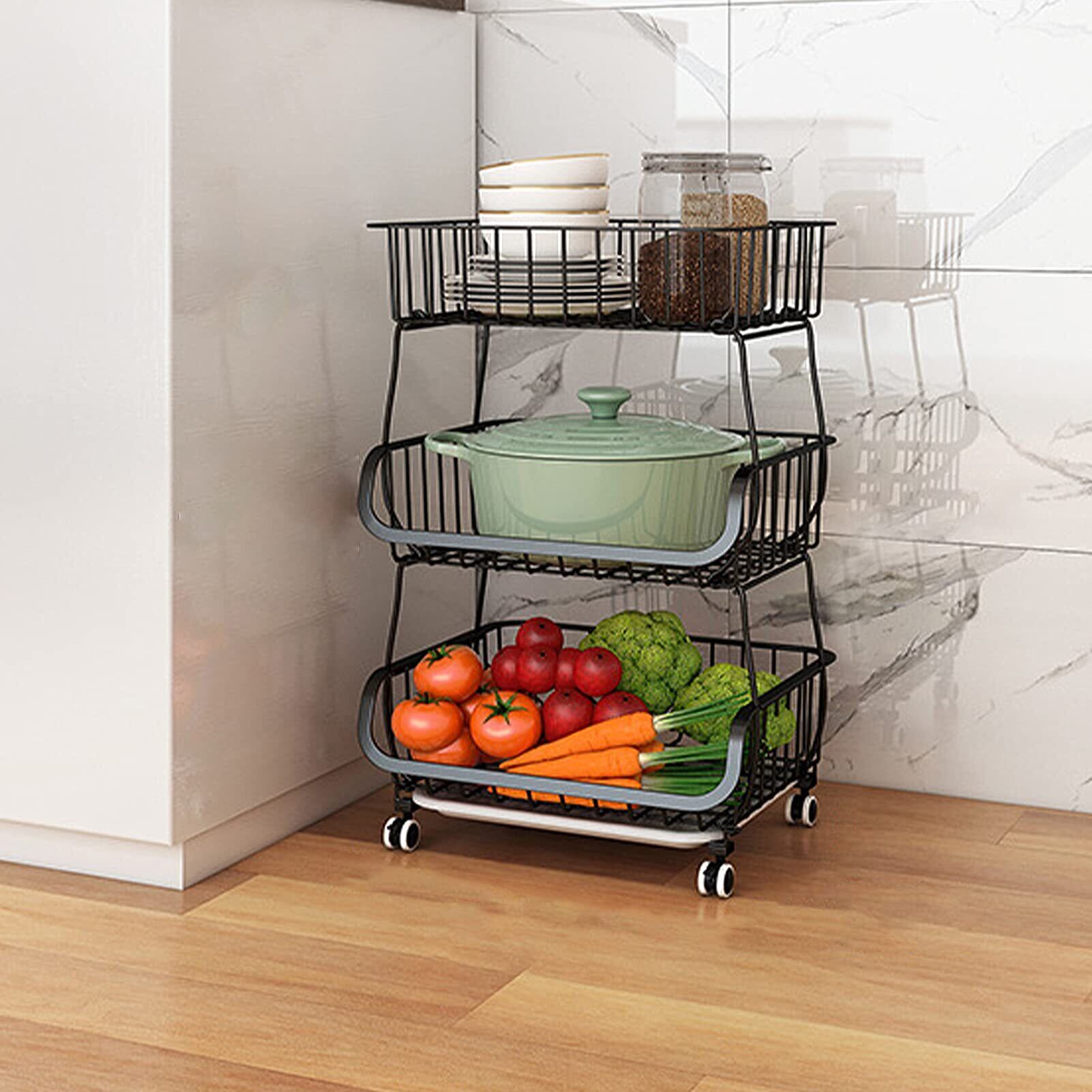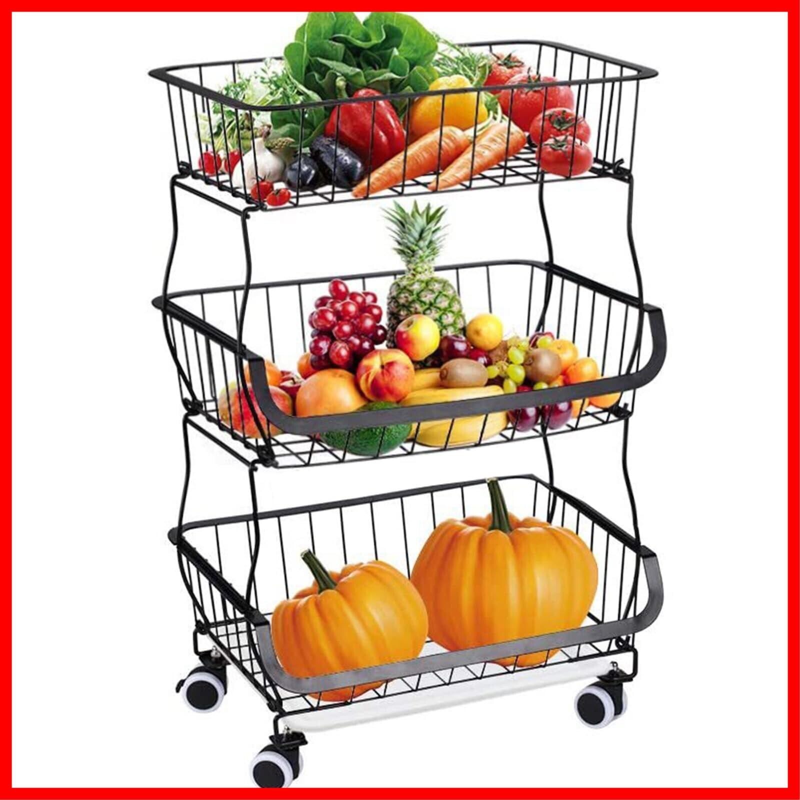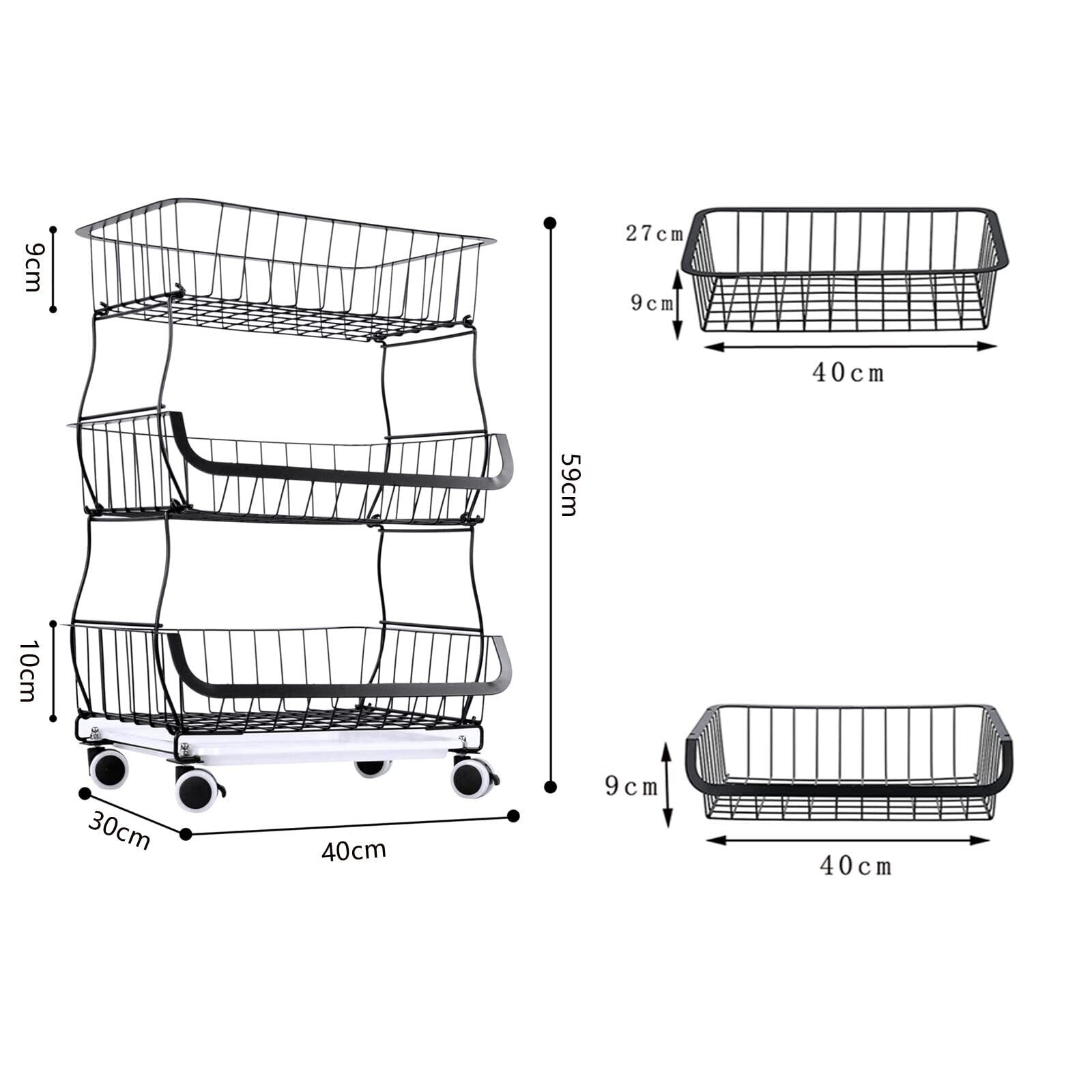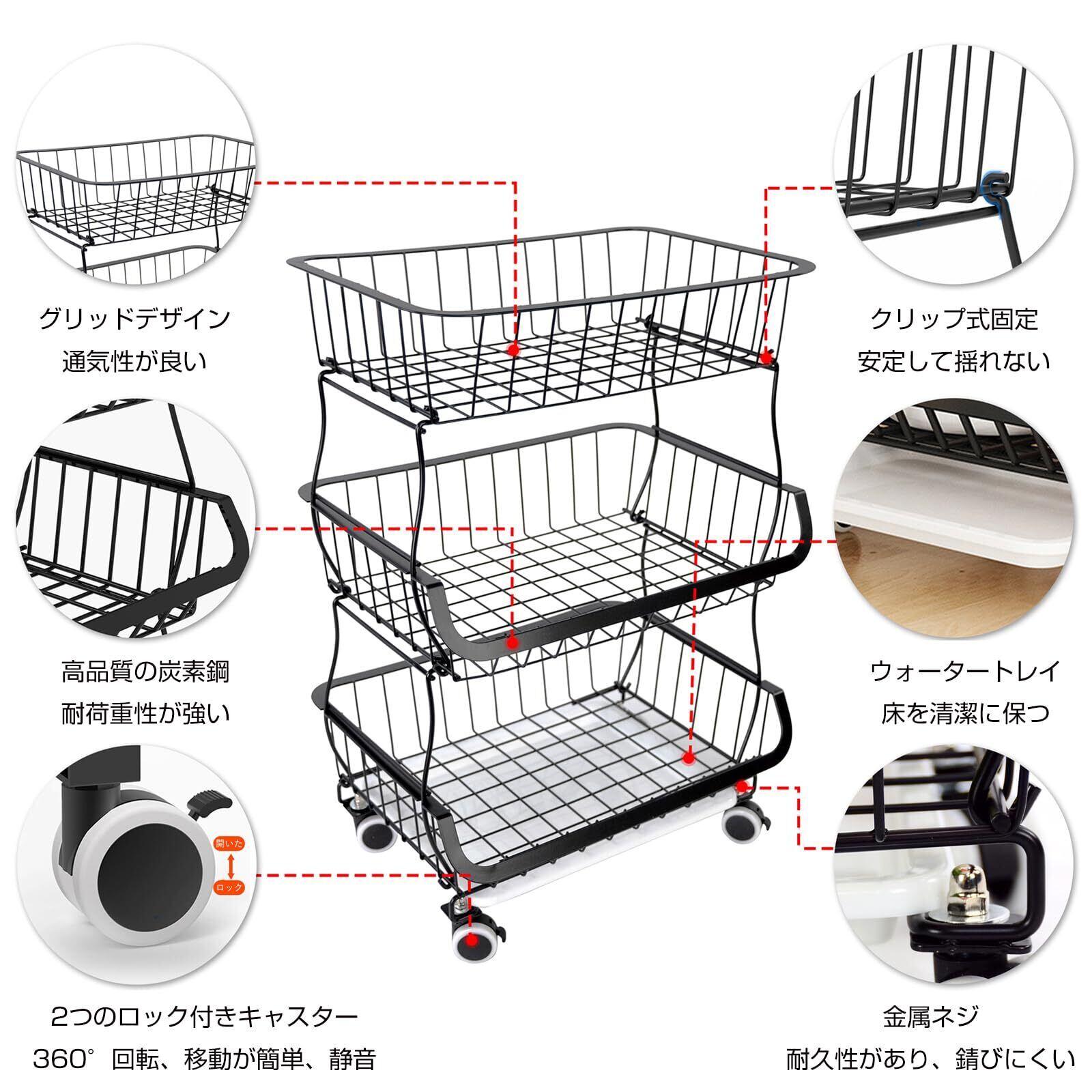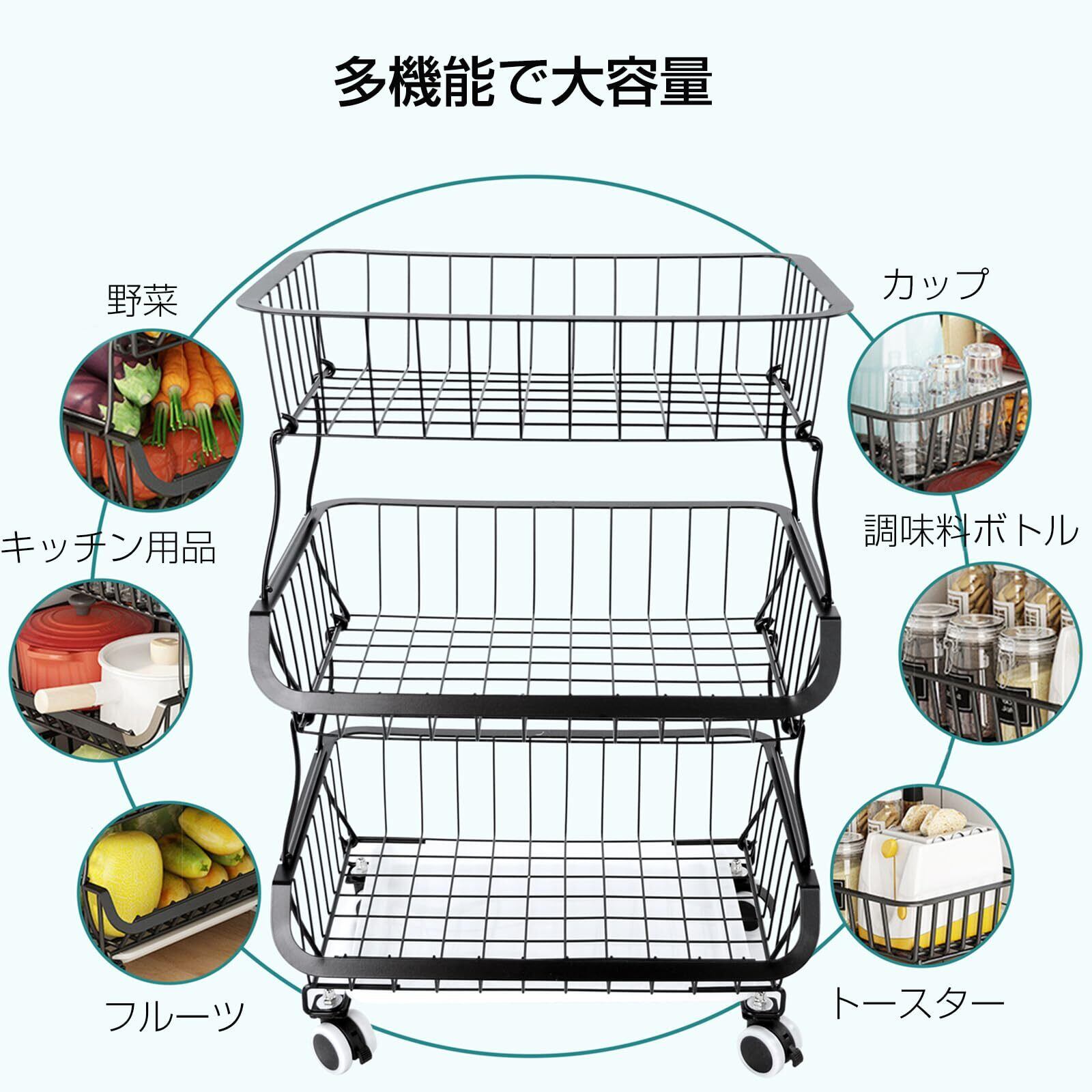 BQKOZFIN スタッキングバスケット キッチンワゴン 収納カート 3段 ワイヤーバスケット 果物と野菜の保管 多機能収納バスケット キャスターとパッド付き ブラック