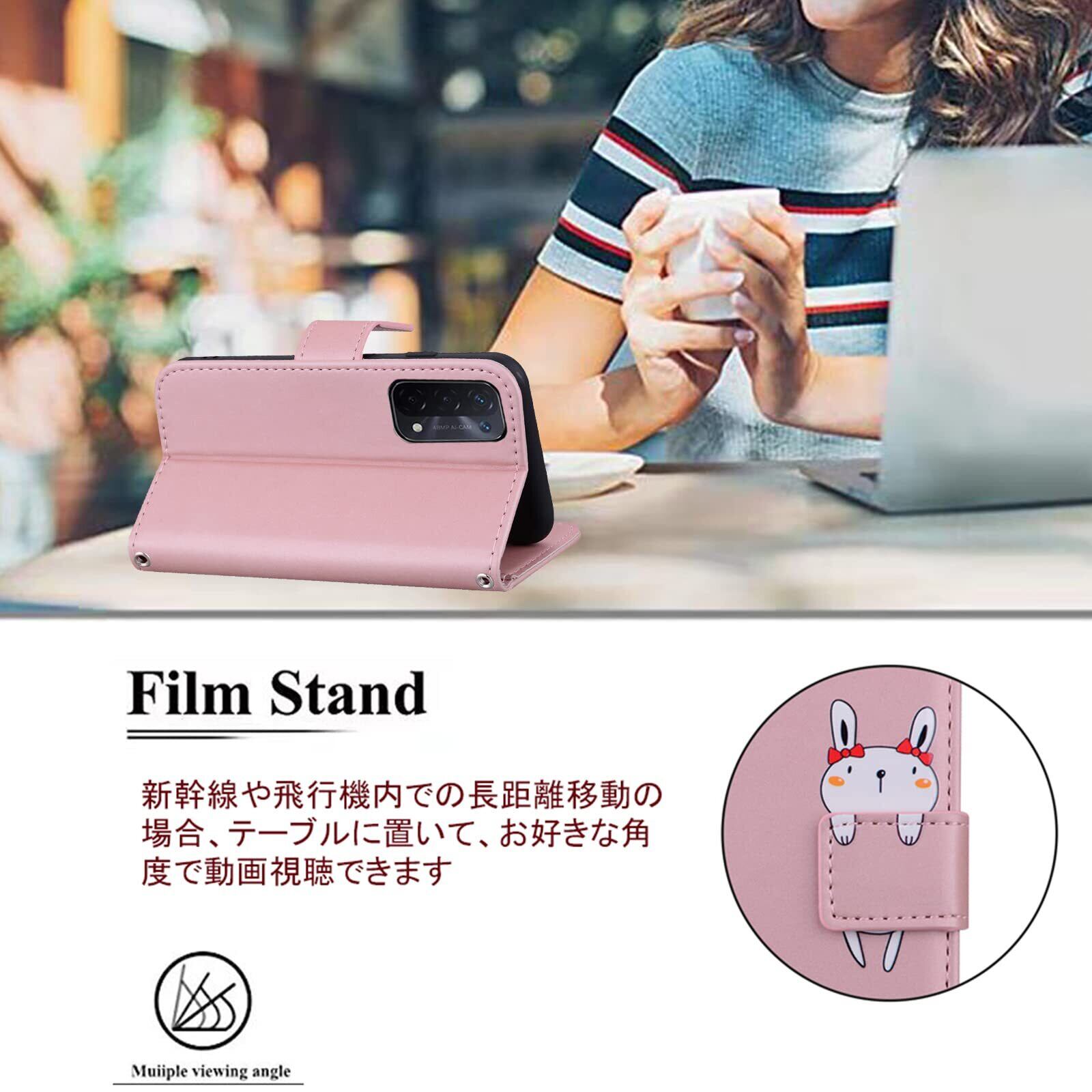 OPPO A54 5G ケース手帳型 OPG02 手帳型ケース OPPO A54 5Gケース 手帳型 携帯カバー オッポ 携帯ケース カバー スマホケース おっぽ手帳型ケース 携帯カバー 肌触り良いレザー 柔らかいTPUケース カード収納 財布型 ベルトマグネット スタンド機能 兎 かわいい 動物柄 薄型 防水 ノート型 人気 おしゃれ 男女兼用 黒 (OPPO A54 5G OPG02 6.5 inch 対応) ゴールドピンク
