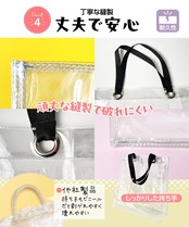 【魅力的な5つのおすすめポイント】丈夫で厚手の生地を使用し、破れにくいので安心して長く使えます。広いマチによる大容量で使いやすく、透明な素材が推しグッズを綺麗に見せます。さらに、急な雨にも大切なアイテムを守り、お気に入りのバッグを中に入れることで可愛さがさらに引き立ちます。