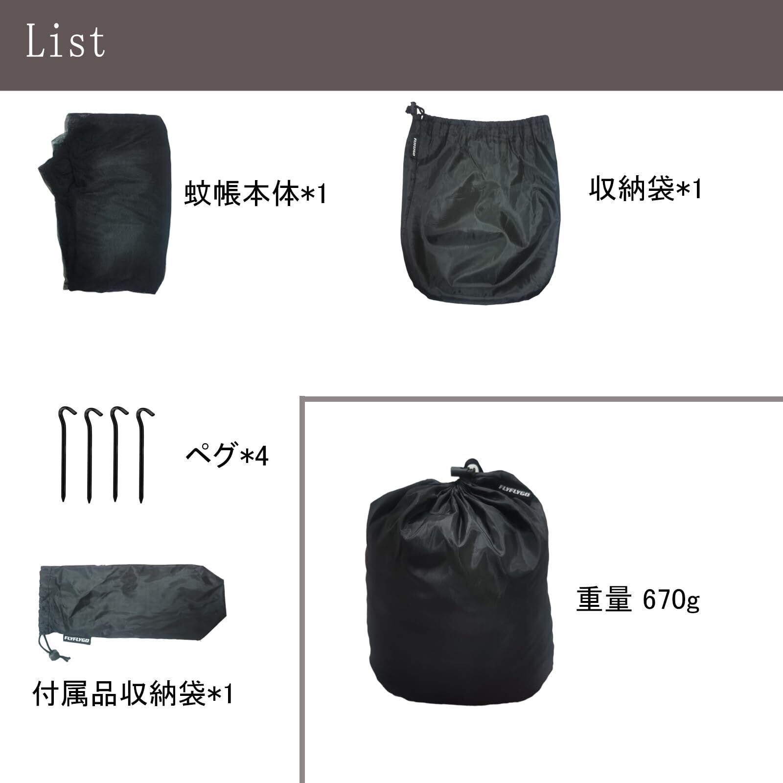 4本のペグ(長さ18cm、アルミ製)が付属しており、蚊帳の上部の4つの角をロープで木の枝やポールに簡単に固定できます。底部の4つの角には、ペグを使って底部を固定するためのロープフックがあり、底部の固定も簡単です。取り付けは非常に簡単で便利です。