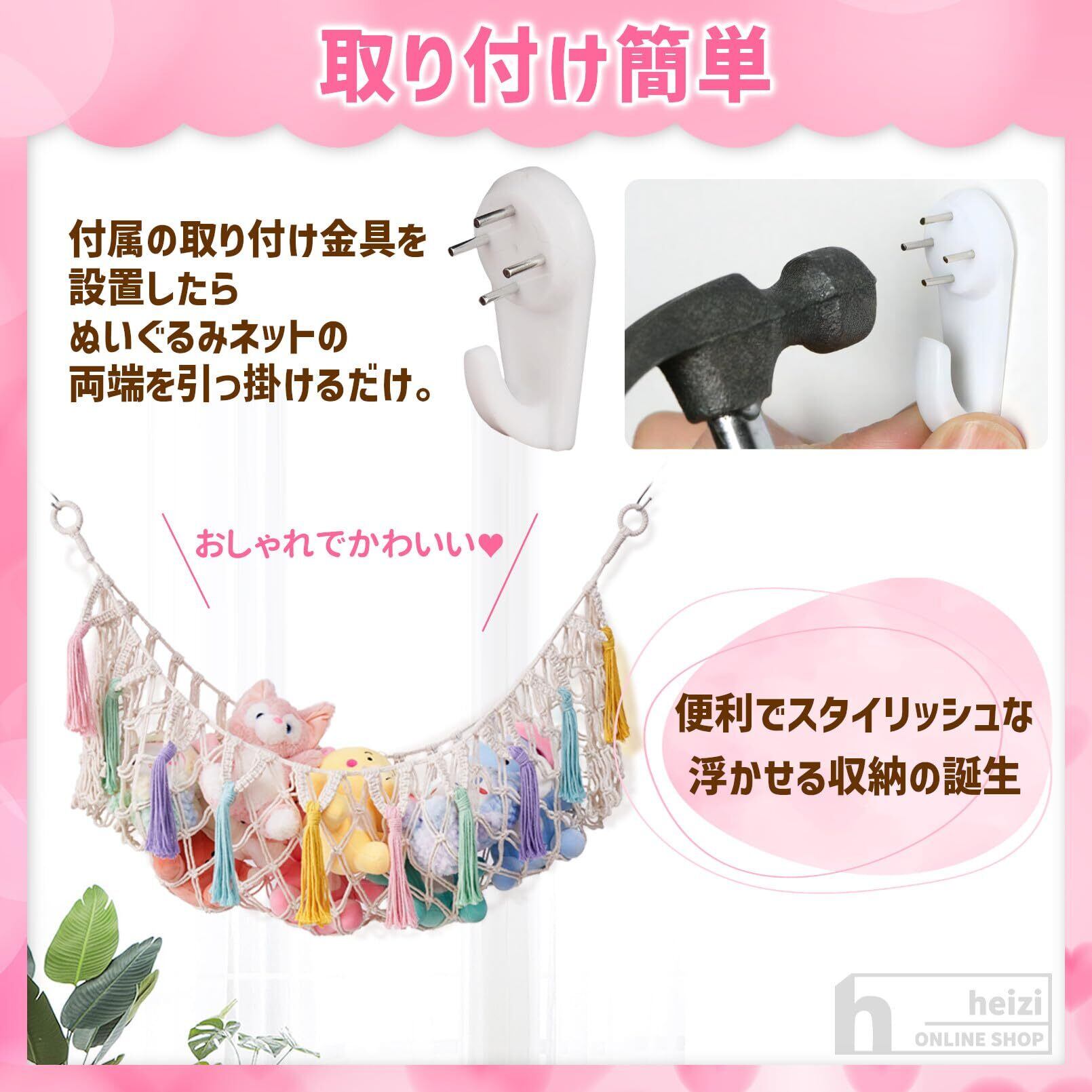【取り付け簡単】付属の取り付け金具を設置したら、ぬいぐるみネットの両端を引っ掛けるだけ。あっという間に浮かせる収納の誕生です。パッと片付けられて、遊びたいぬいぐるみもすぐ見つけられるスグレモノアイテムです。