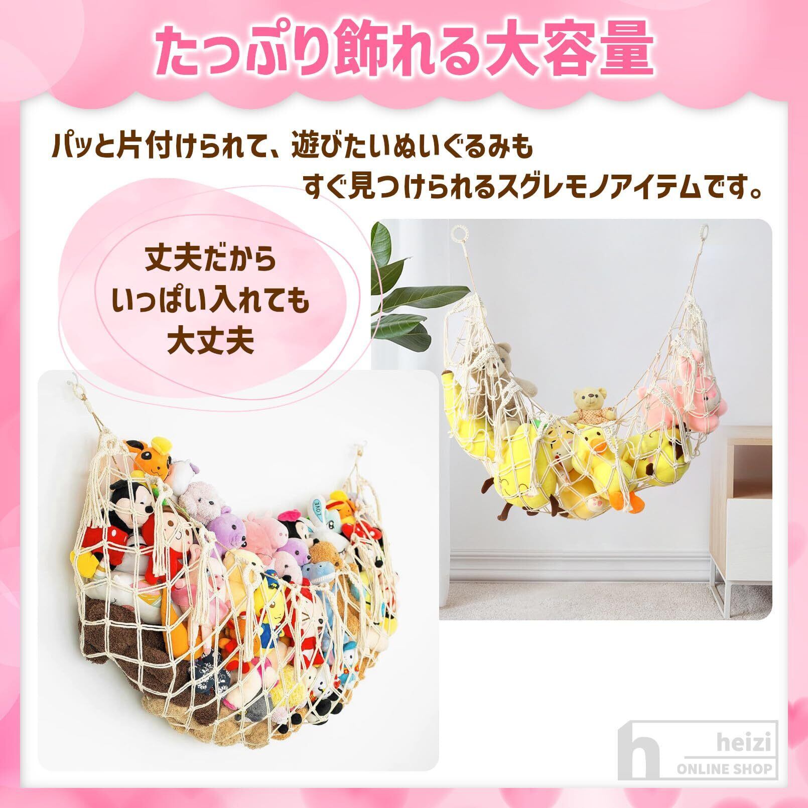 【飾れるぬいぐるみ収納】可愛いぬいぐるみを魅力的に収納できるハンモック型収納です。上質なコットンロープを使って手織りされており、温かみのあるナチュラルな風合いが特徴。ぬいぐるみをおしゃれに大切に保管できます。
