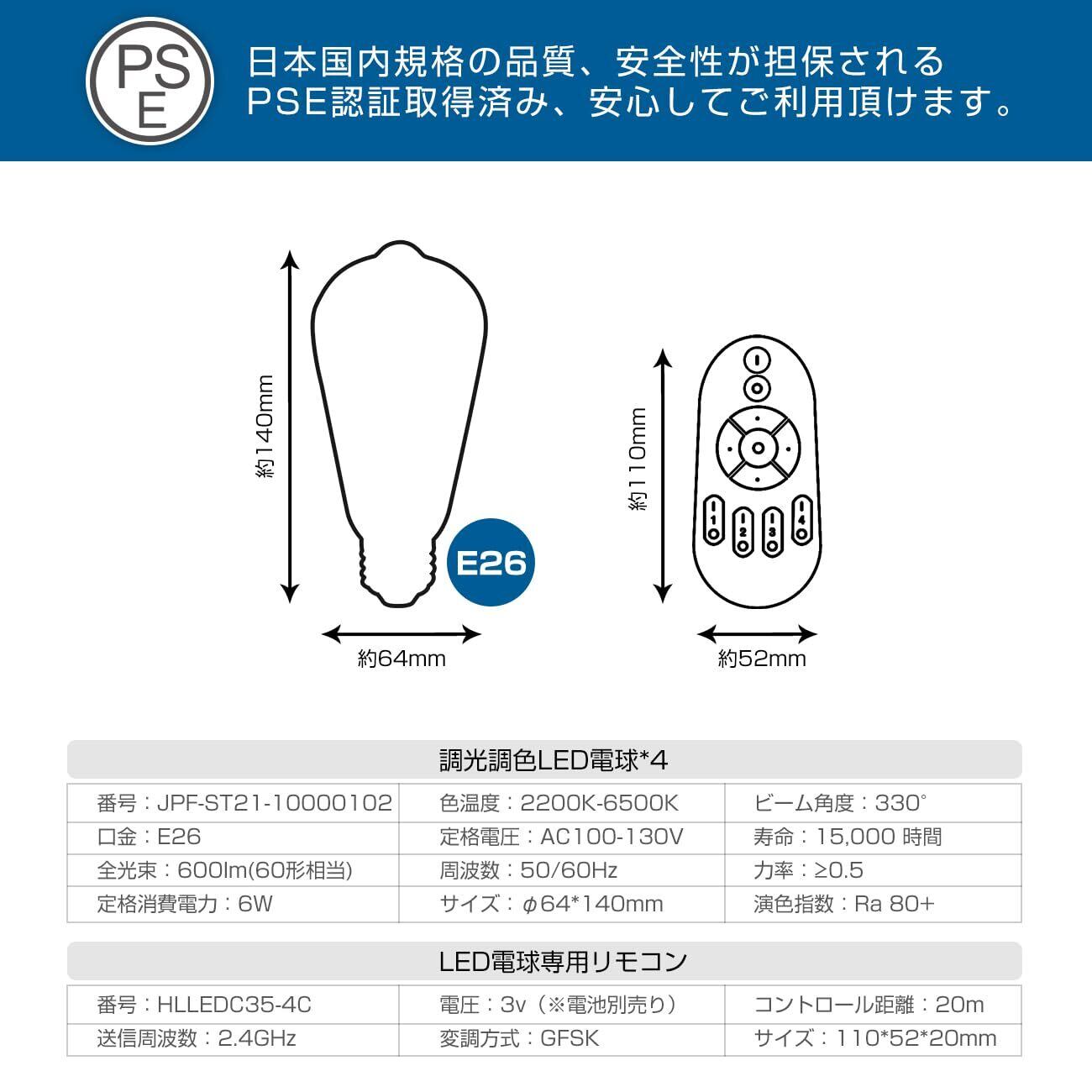 【商品仕様】素材:ガラス。Ra>80。電球サイズ:直径64mmx高さ140mm。全光束:600LM(調光可能)。色温度:2200-6500K(調色可能)。口金:E26。調光:リモコン付き(電池別売。物流の安全を確保するために、当社のリモコンには電池が含まれていません。)
