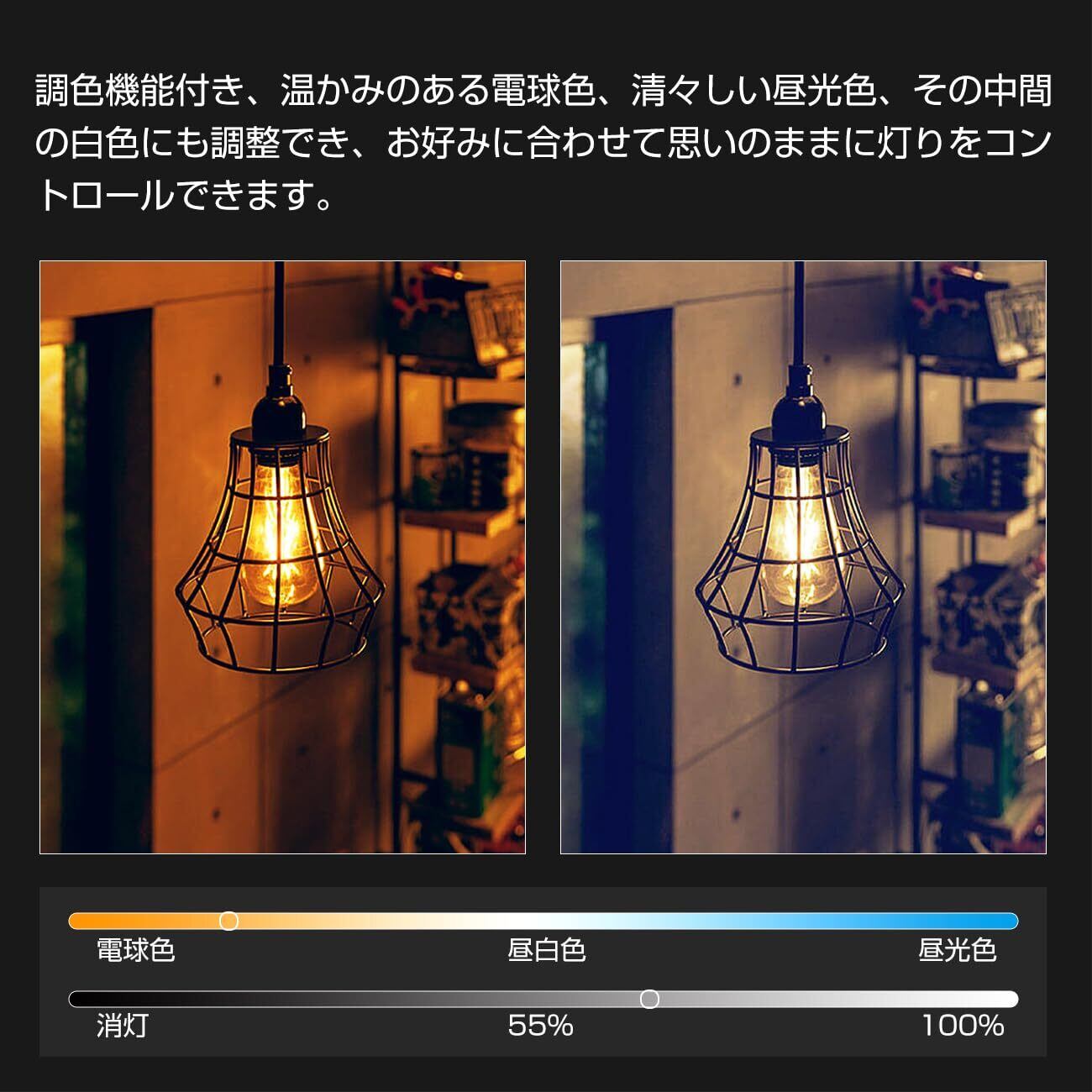 【調光調色機能】明るさは10%から100%の間で調節可能です。調色機能付き、温かみのある電球色、清々しい昼光色、その中間の白色にも調整でき、お好みに合わせて思いのままに灯りをコントロールできます。必要な雰囲気に応じて色温度を調整できます。調光で実現できる節電効率は90%! 美しいだけでなく省電力も実現!