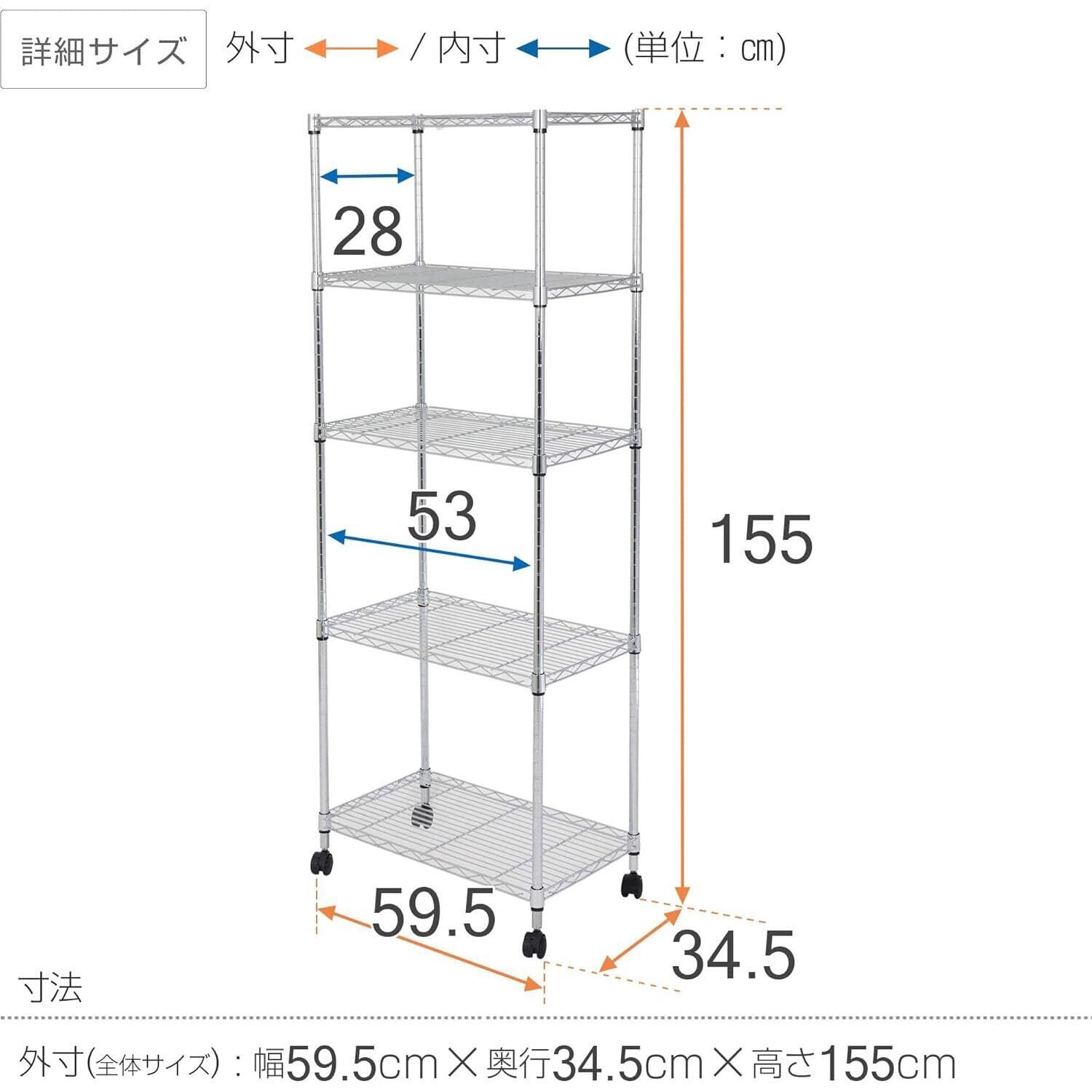 ドウシシャ メタルルミナスラック キャスター付き スチールラック幅60 5段 EL19-15605 軽量で組立簡単工具いらず 幅59.5×奥行き34.5×高さ155.0cm 棚板耐荷重80kg 全体耐荷重400kg 頑丈 防錆加工 ポール径19mmパーツ対応 キッチンラック 隙間収納