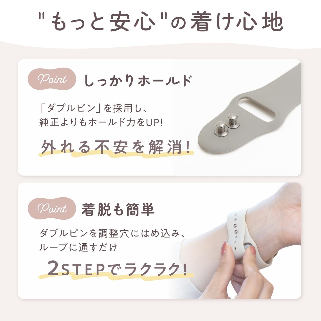 ▶▶▶【ぴったりフィット】:7個の調整穴で"ちょうどいい"サイズに調整可能。▶▶▶【しっかりホールド】:「ダブルピン」を採用し、純正よりもホールド力UP▶▶▶【簡単着脱】:ダブルピンを調整穴にはめ込み、ループに通すだけのラクラク「2 STEP」