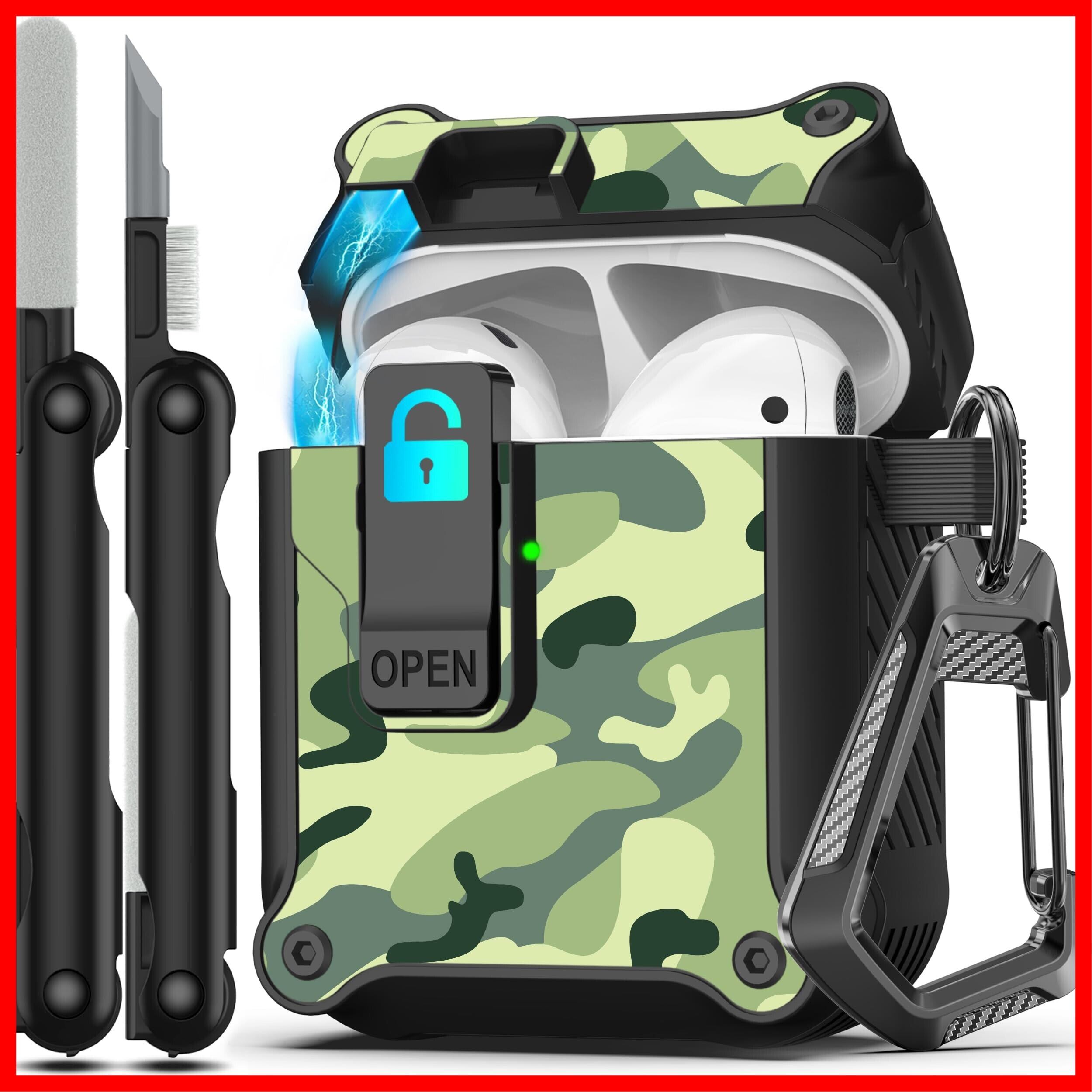 RFUNGUANGO Airpods 第 2 世代および第 1 世代保護ケース 安全ロッククリップ付き自動ポップアップ、キーチェーン付きフルボディ耐衝撃ハードケース (無料クリーニングツール) - レインフォレスト迷彩 | hananoki