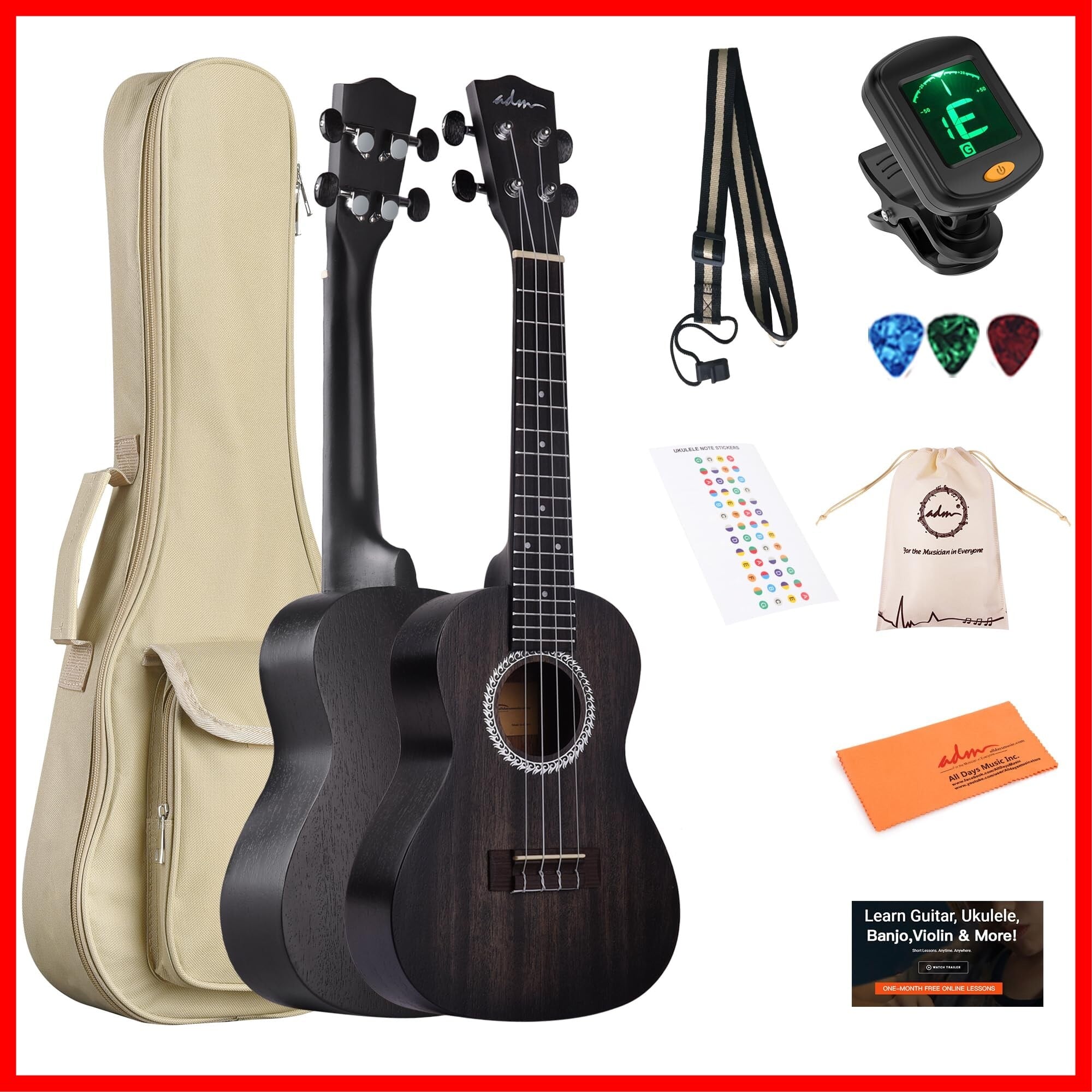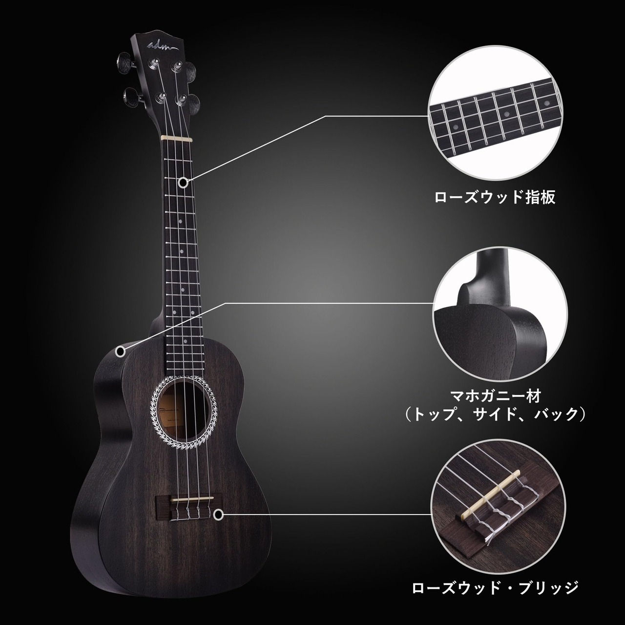 ADM コンサートウクレレキット、23インチ マホガニー 初心者ウクレレセット - ギグバッグ、チューナー、ストラップ、指板ステッカー、ピック、収納バッグ付き (マットブラック) | hananoki