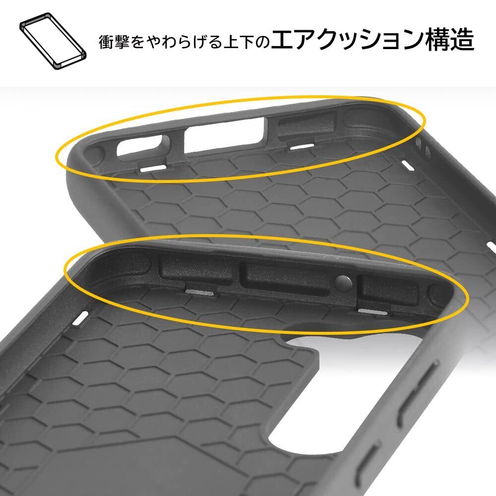 衝撃をやわらげるTPU×鉛筆硬度3Hで傷に強いポリカーボネイト。ケース上部と下部は衝撃をやわらげるエアクッション構造。画面を下向きに置いても傷が付きにくい。カメラレンズに傷が付きにくい。