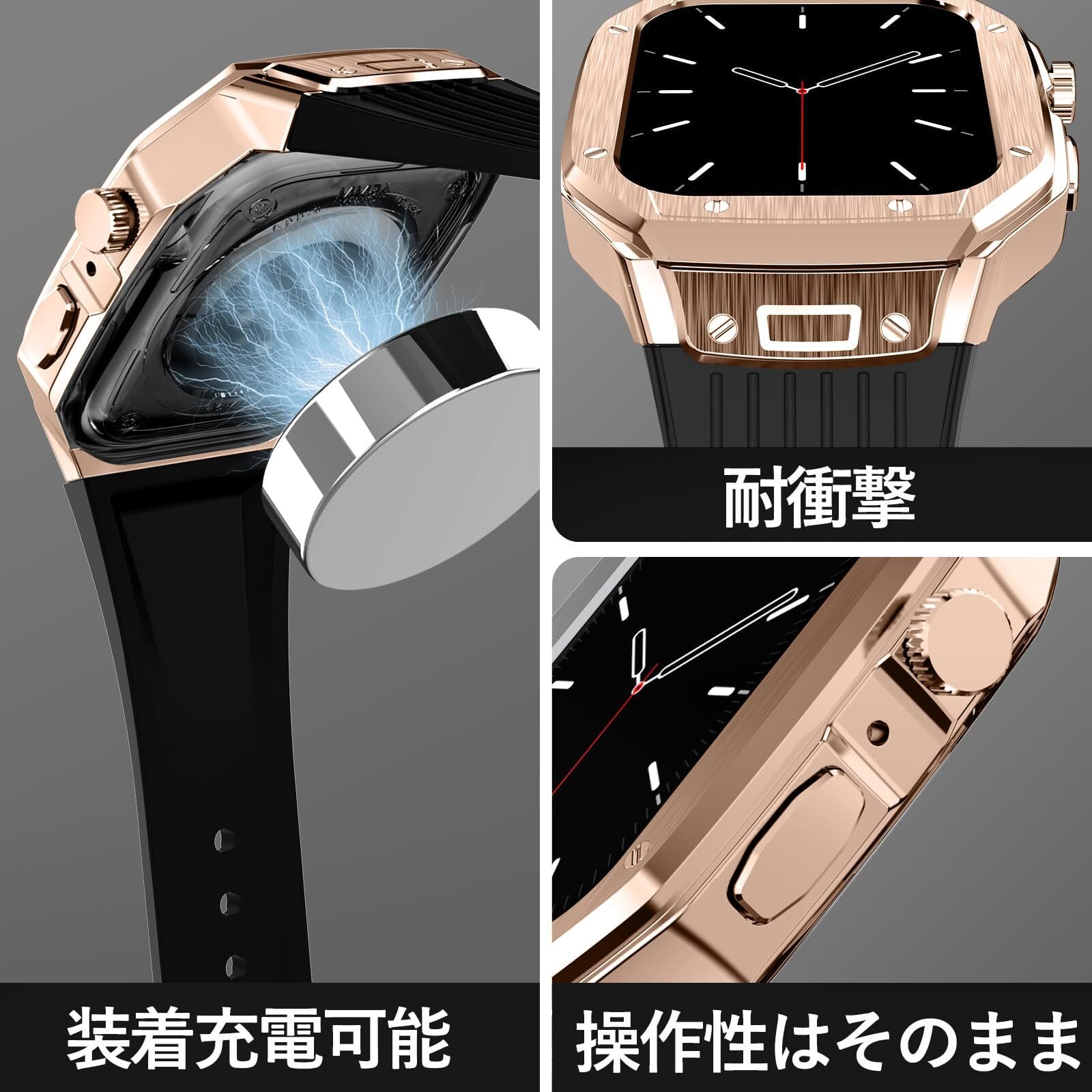 YOFITAR for Apple Watch バンドとケースと背面ケースの3in1一体型デザイン 45mm/44mm apple watch 一体型バンド Series 9/SE/8/7/6/5/4対応 メンズ かっこいい アップルウォッチ バンド カバー付き アクセサリー(45mm/44mm,ローズゴールドケースとブラックベルト)