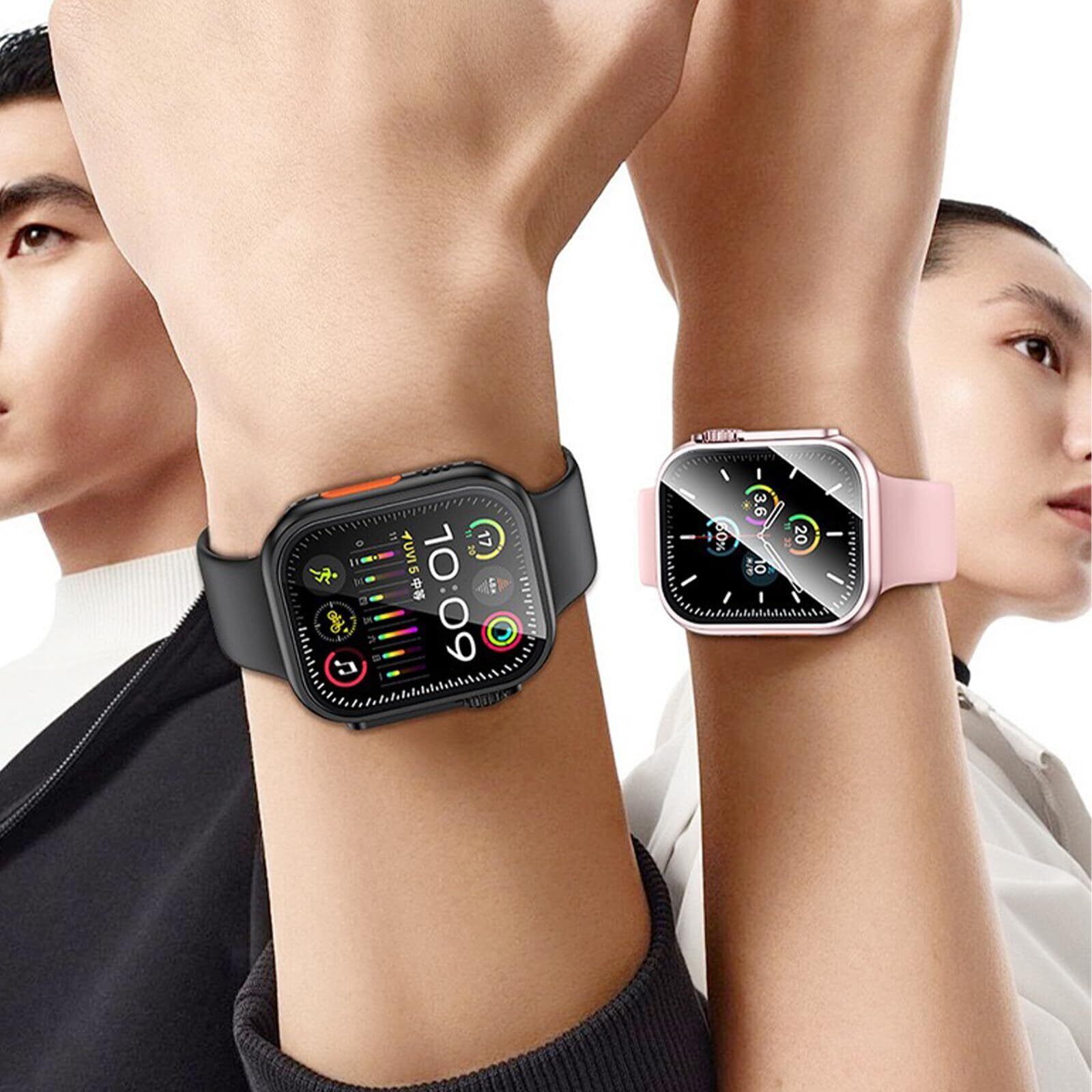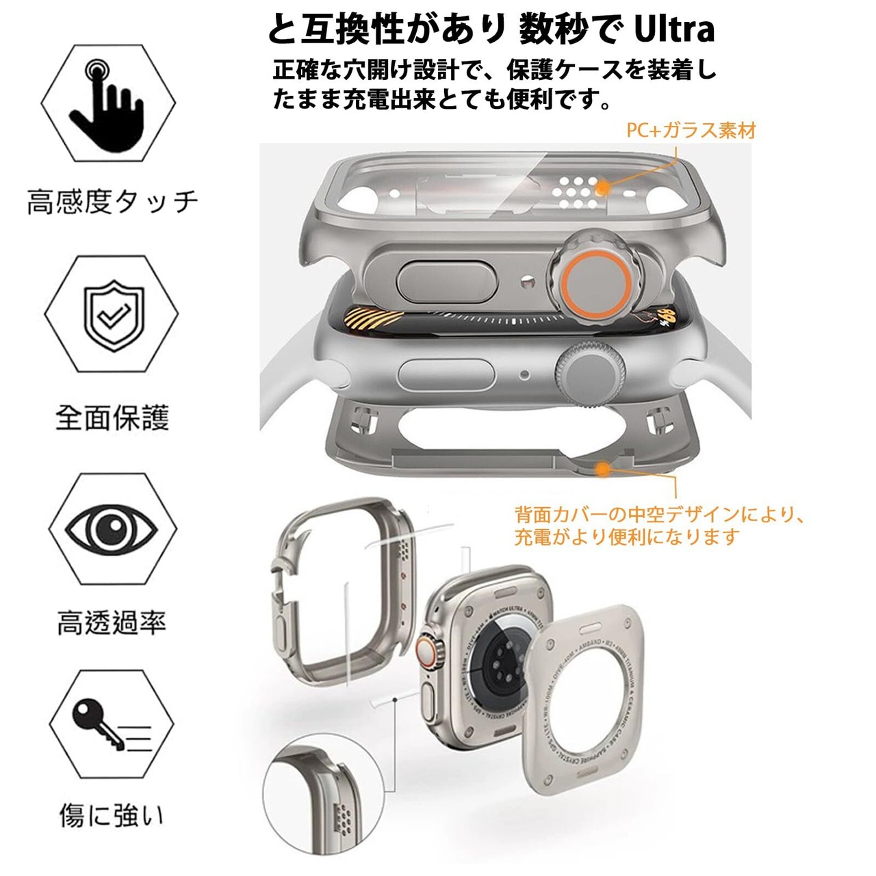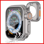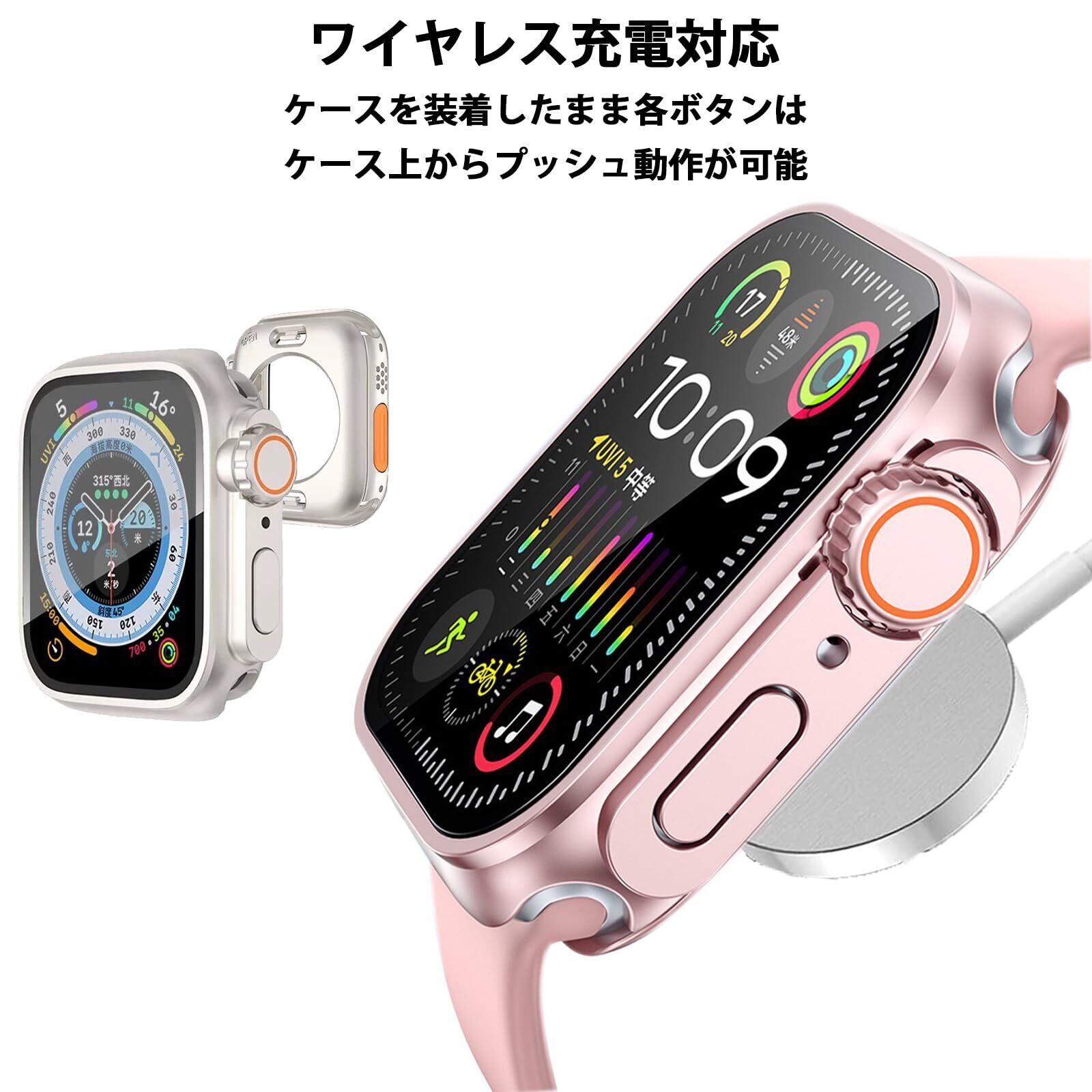 【高品質素材】Apple Watch カバーの液晶保護フィルムは硬度9Hの強化ガラスを採用しキズに強く耐久性があり、高解像度で高透過率、タッチもスムーズです、耐傷性、耐衝撃性に優れ。今までの保護ケースを基に改良し、防水機能が向上しました、カラーや見た目はUltraとほぼ同。