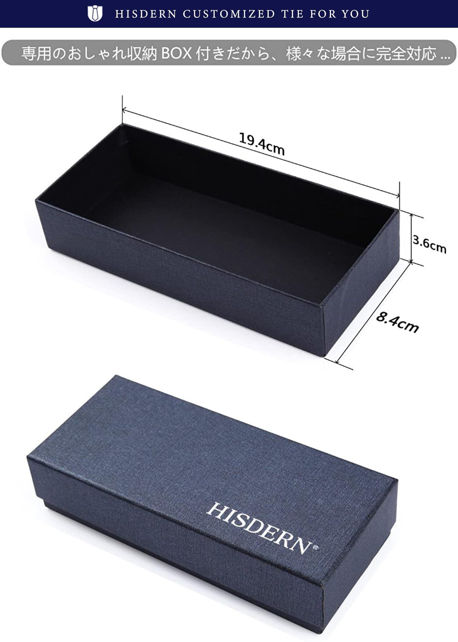 【3点セット】ネクタイ1本 + ポケットチーフ1本 + ネクタイピン1本 、HISDERNブランド専用ボックスが付き 商品サイズ:ネクタイ 幅8.5cm / 長さ150cm | ポケットチーフ: 31cm*31cm | ネクタイピン:5.8cm × 0.6cm。