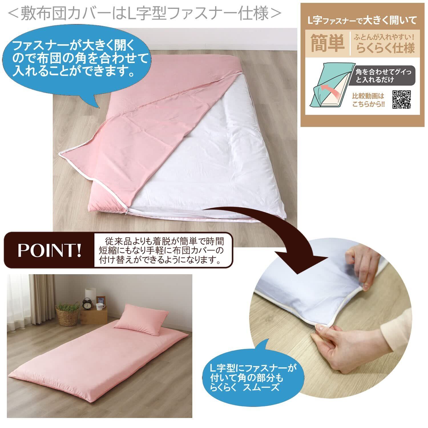 「速乾」「シワになりにくい」「L字ファスナー」が特長の取り扱いがしやすい敷布団カバー。L字型にファスナーがついている為、カバーの角が開き 敷布団の出し入れがしやすく 従来品よりも着脱が簡単になり めんどうな布団カバーの取り外しも楽になります。取り扱いがしやすいのも日常使いのアイテムには大切なポイントです。