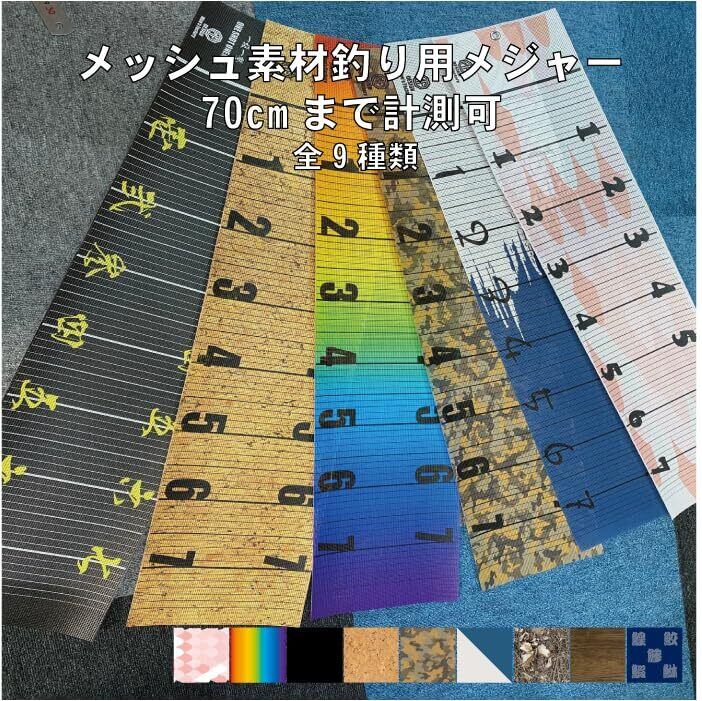 選べる9タイプお好みのデザインをお選びいただけます。 ◇全9種類からお選びいただけます! 1.鱗ピンク 2.ブラック 3.レインボー 4.迷彩柄 5.波ネイビー 6.コルク柄 7.枯れ葉柄 8.木目柄 9.魚漢字柄 ◇素材 メッシュターポリン ハトメ付き メッシュタイプにすることで水を保ち、魚へのダメージを軽減。 軽量で持ち運びにも最適! 発色・耐久性・しなやかさに優れ、なおかつ色褪せしにくい万能な素材でできています。 ■長さ:約90cm ※目盛部分は75cm ■幅:20.5cm 文字が大きいので釣った魚のサイズを測って写真を撮るのにGOOD 釣り用にミーズファクトリーオリジナルで作成!
