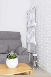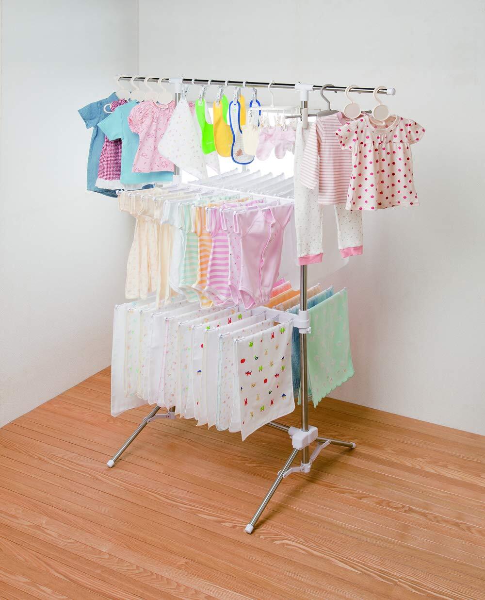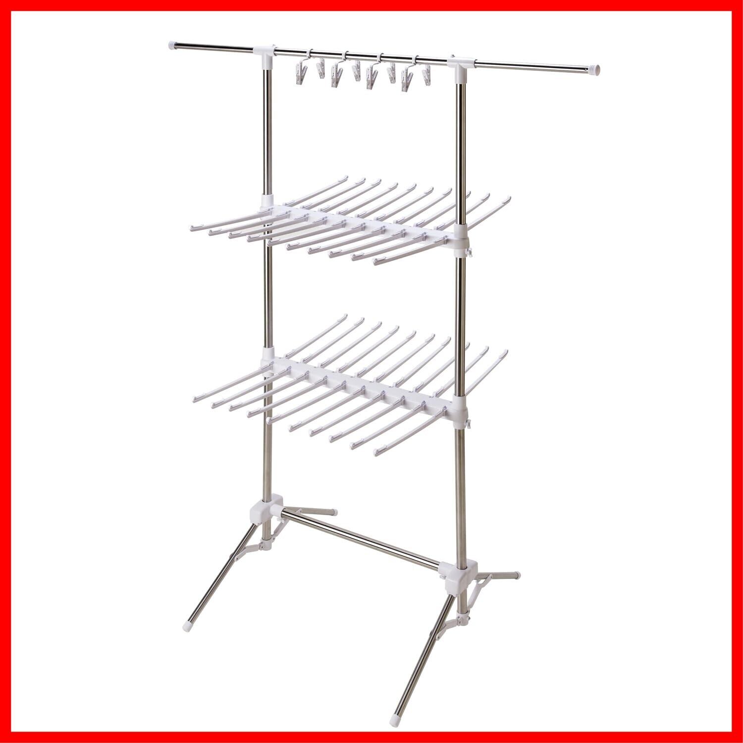 ファミリー向け大容量ものほし。タオルハンガー40本、ピンチハンガー4個(ピンチ8個)付です。収納は幅約16cmとスリムになります。耐荷重約10㎏迄。(材質)パイプ:ステンレス巻きスチールパイプ、成型部品:ABS樹脂、PP樹脂、金属部品:スチ-ル(メッキ)