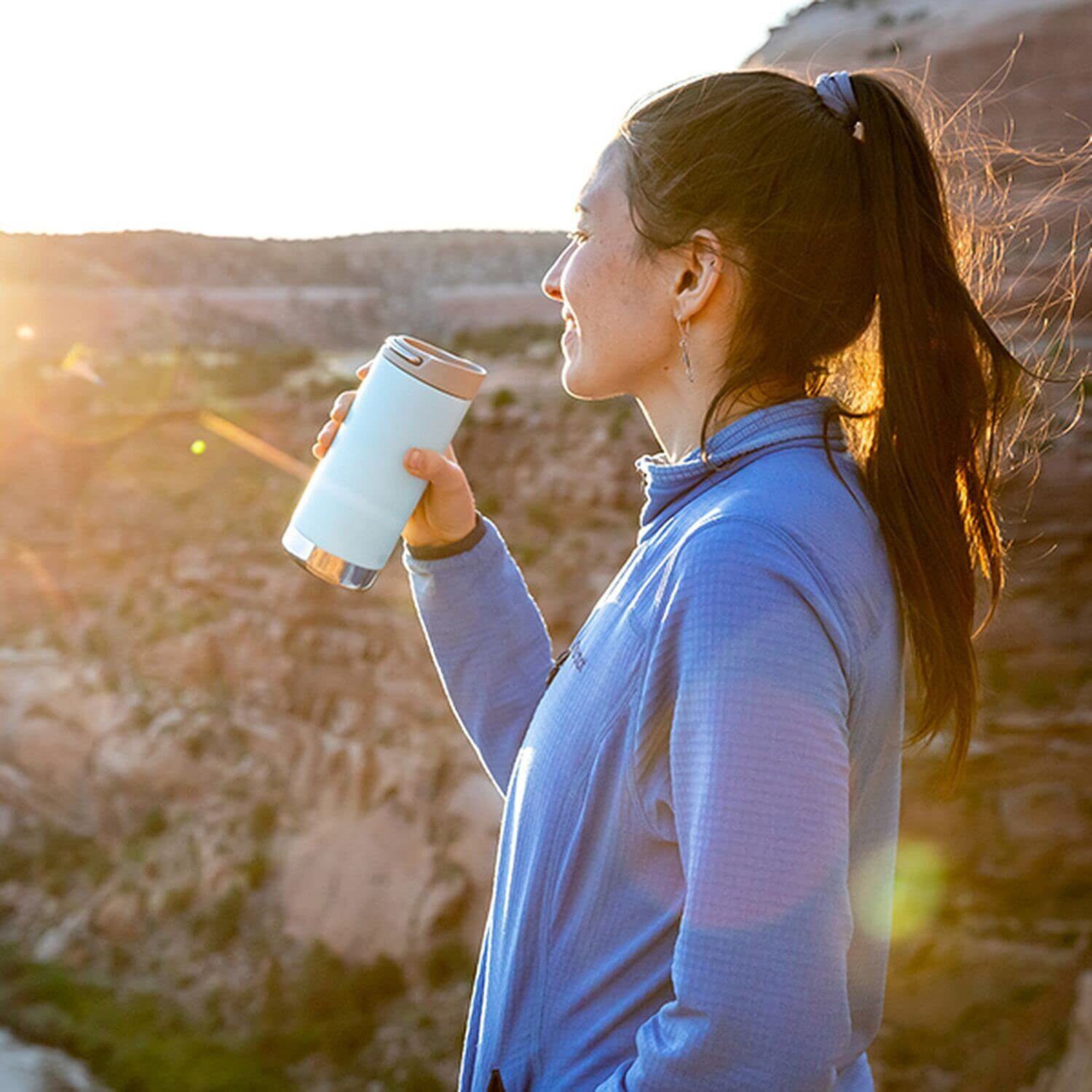 真空断熱構造により保温保冷で使えるステンレスボトル。付属のカフェキャップは漏れ防止機能と持ち運びやすいステンレスループが付いており、オフィスでのコーヒーマグ、アウトドア、携帯用として、日常のどんなシーンでもお好みのドリンクをお楽しみいただけます。