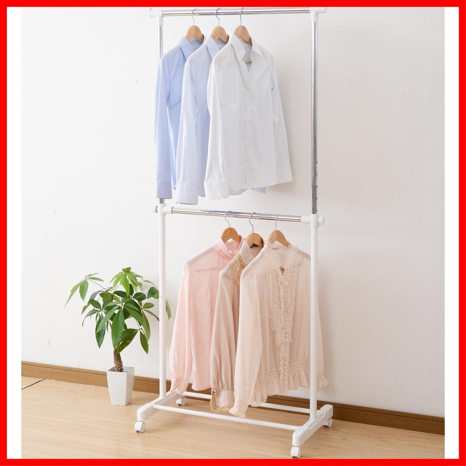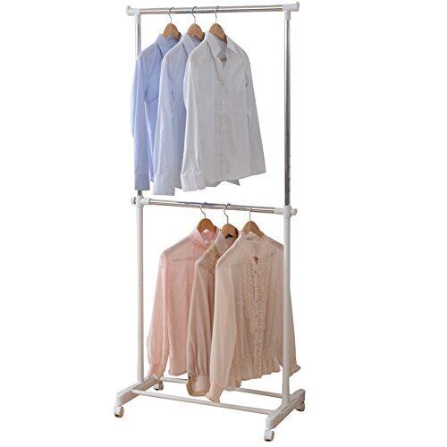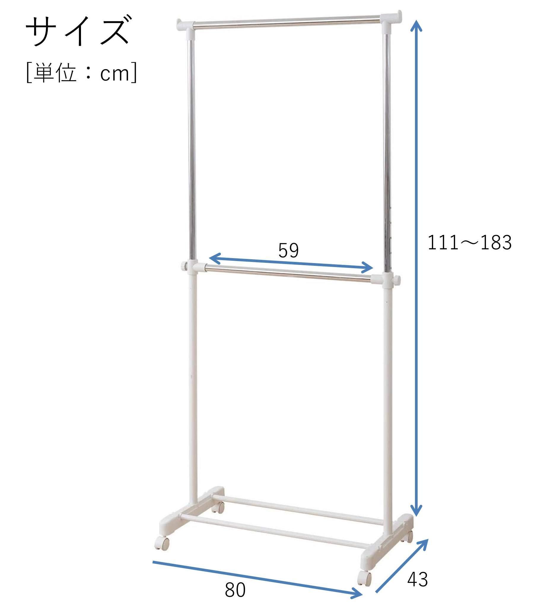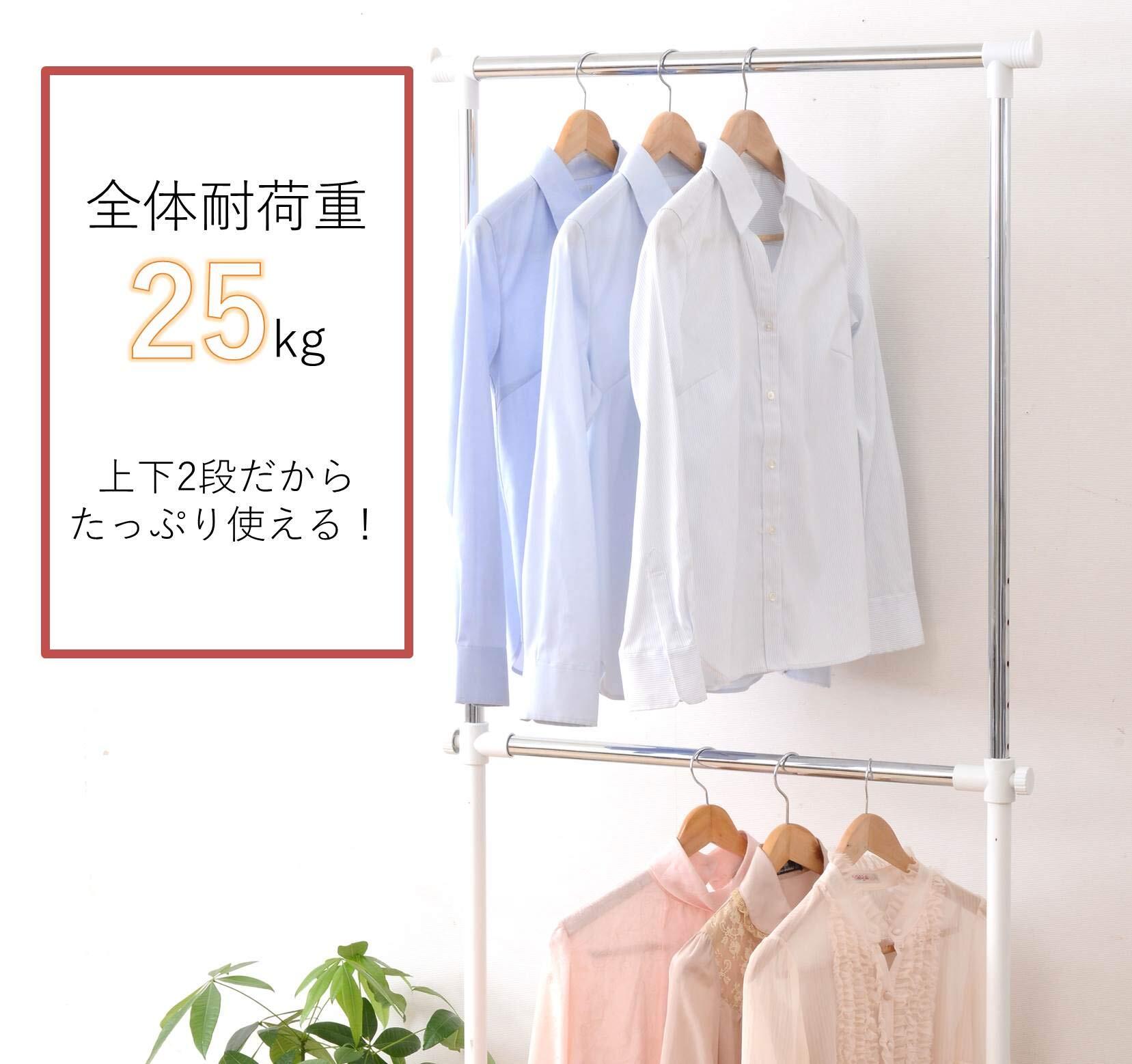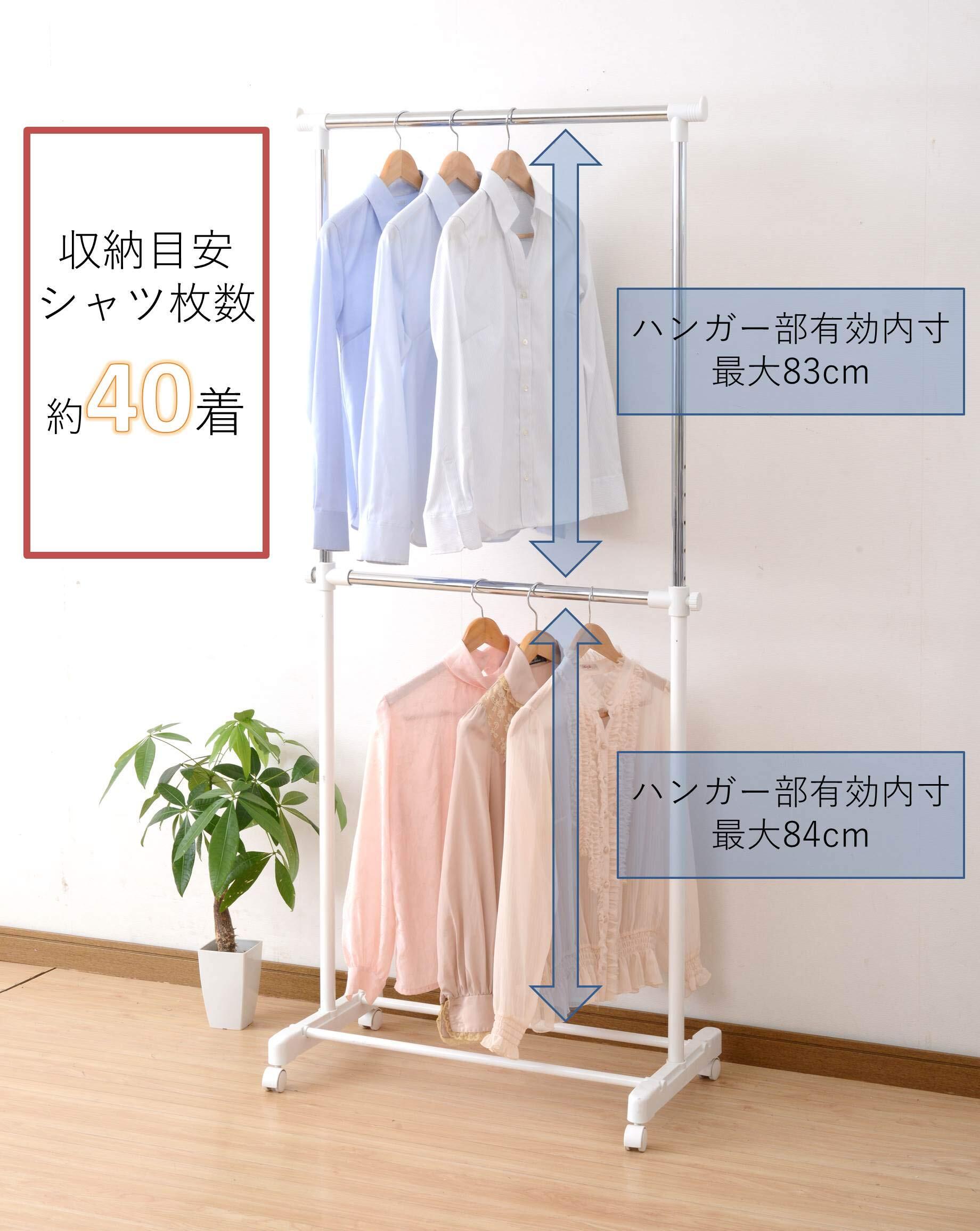 ●組立品です●組立時間:約10-20分●2段掛式のパイプハンガー●上段内寸:幅66 高さ83cm●下段内寸:幅59 高さ84cm●シャツ収納目安: 40着●全体耐荷重:25kg●キャスター付きで移動もラクラク