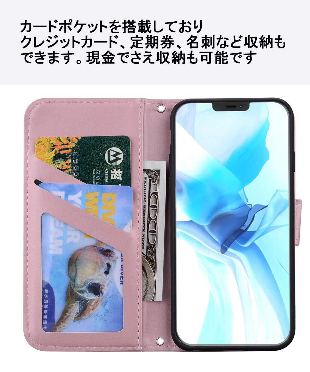 ❷【収納性・財布型】ケースの裏側にカードポケット2つ,クレジットカード、idカード、定期券を収納可能、透明ポケットに写真、名刺入れも可能です。❸【横置きスタンド機能付き】動画の視聴やテレビ電話などを長時間行っても疲れません、新幹線、飛行機の中で暇つぶしに最適。
