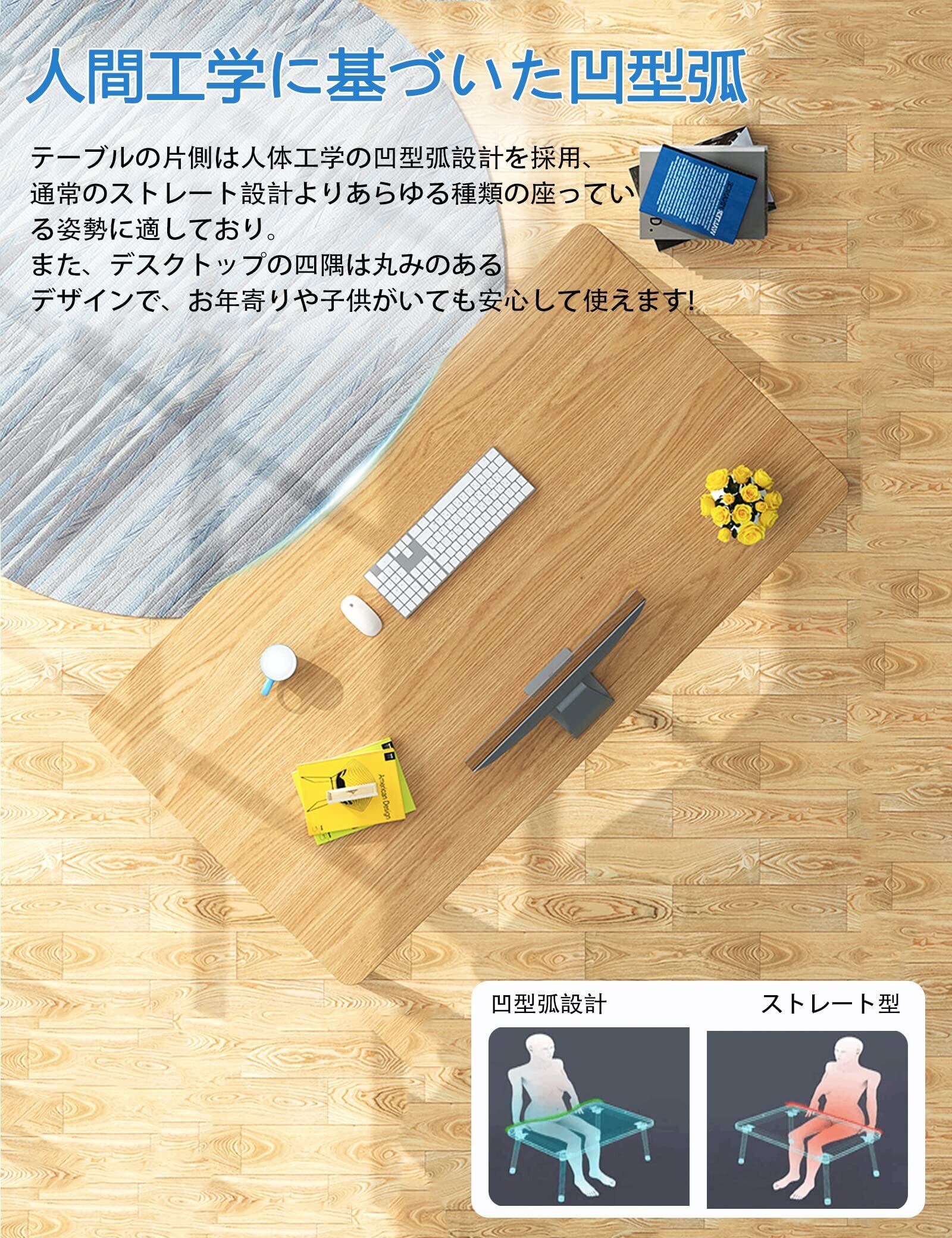 人間工学に基づいた凹型弧: テーブルの片側は人体工学の凹型弧設計を採用で、通常のストレート設計よりあらゆる種類の座っている姿勢に適しており。また、デスクトップの四隅は丸みのあるデザインで、お年寄りや子供がいても安心して使えます!