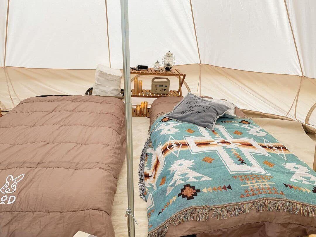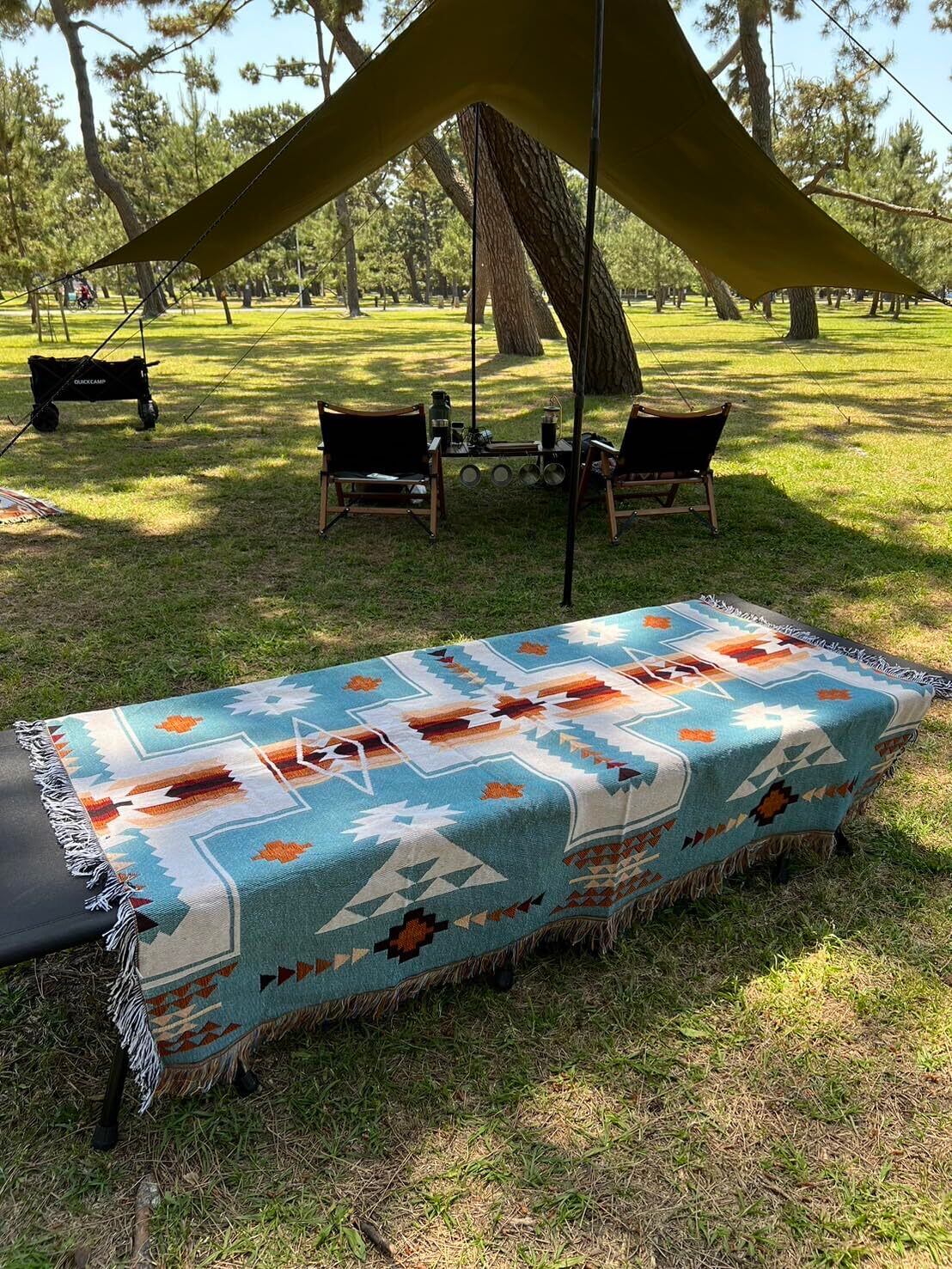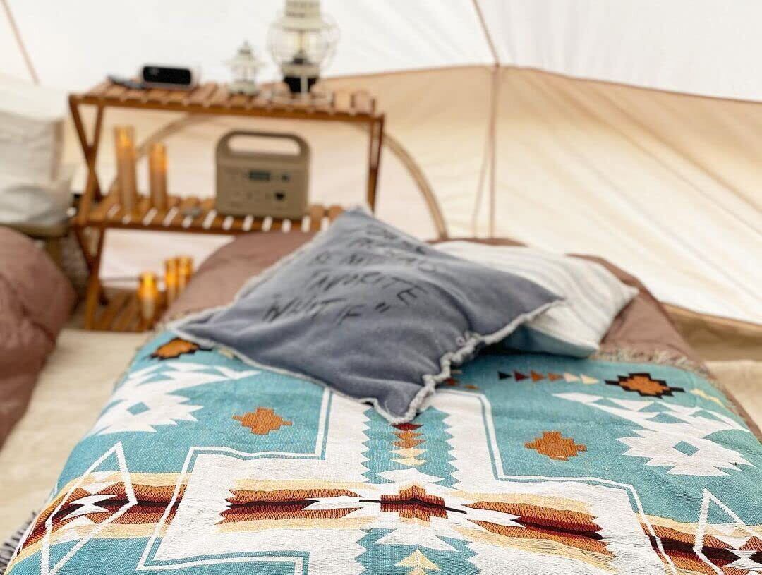 テーブルクロスとして活用しているキャンパーもたくさんいます。アンティーク調のキャンプ用品を置くことで、気分はネイティブアメリカン!